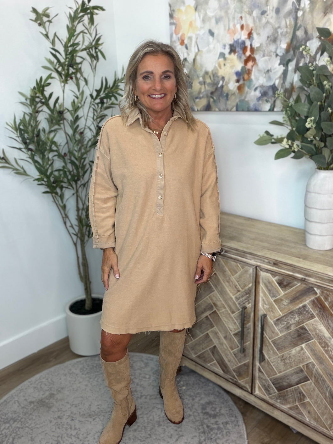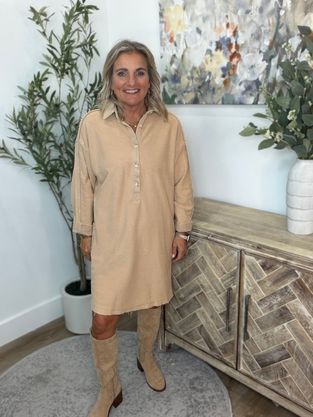 This cozy long sleeve dress features a soft washed French terry fabric that feels gentle against your skin. The collared design with a half-button front adds a touch of casual polish.