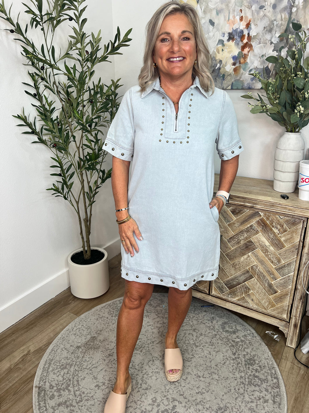 This studded denim dress is short, sweet, and full of edge. Perfect for a night out or a casual day, the washed denim adds a vintage touch while the studs add a little extra!