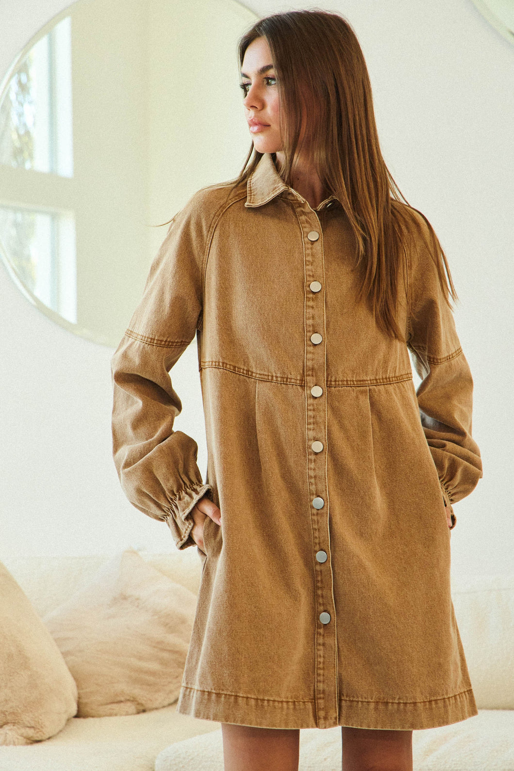 The Riley is your go-to denim dress for effortless style. This charming camel-toned piece features a classic button-front design that's perfect for layering or wearing solo. The timeless denim fabric offers durability and comfort, while the warm neutral shade pairs beautifully with everything in your closet.