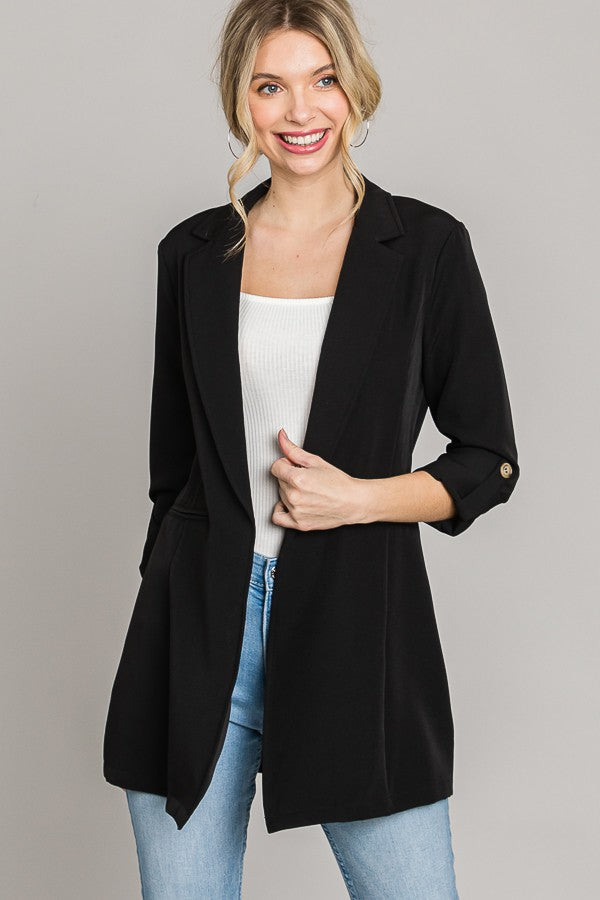This Cole Blazer is perfect for a professional and polished look. Featuring a roll tab long sleeve design, this blazer will elevate any outfit while keeping you comfortable.