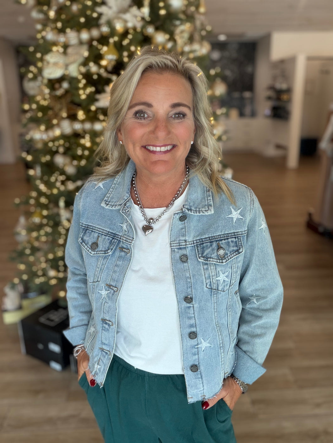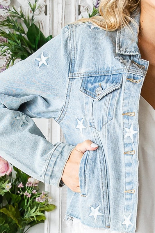 Express yourself with this star-spangled light-wash denim cropped jacket! Featuring star embroidery, a collared neck, and button-up closure, you'll be the cutest!
