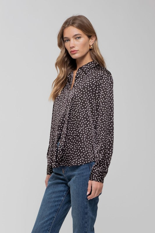 Indulge in luxury with our button up silky blouse. With its delicate small dot pattern, this blouse exudes elegance and sophistication. Perfect for any occasion, this blouse will make you feel like a true fashion icon. If between sizes, size up on this one.