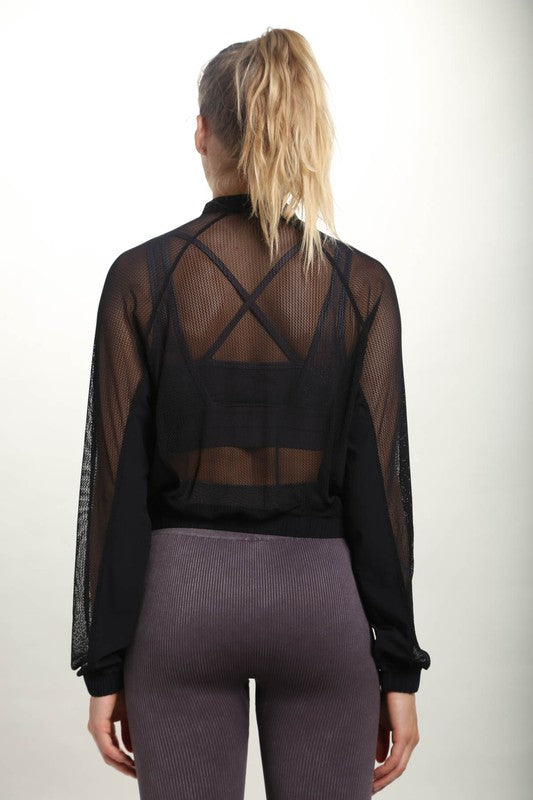This mesh zip-up jacket features contrasting solid angular panels on the sleeves and front, cropped fit with long-sleeves. Layer it over your favorite set. Model is 5'8.5" and is wearing an S.