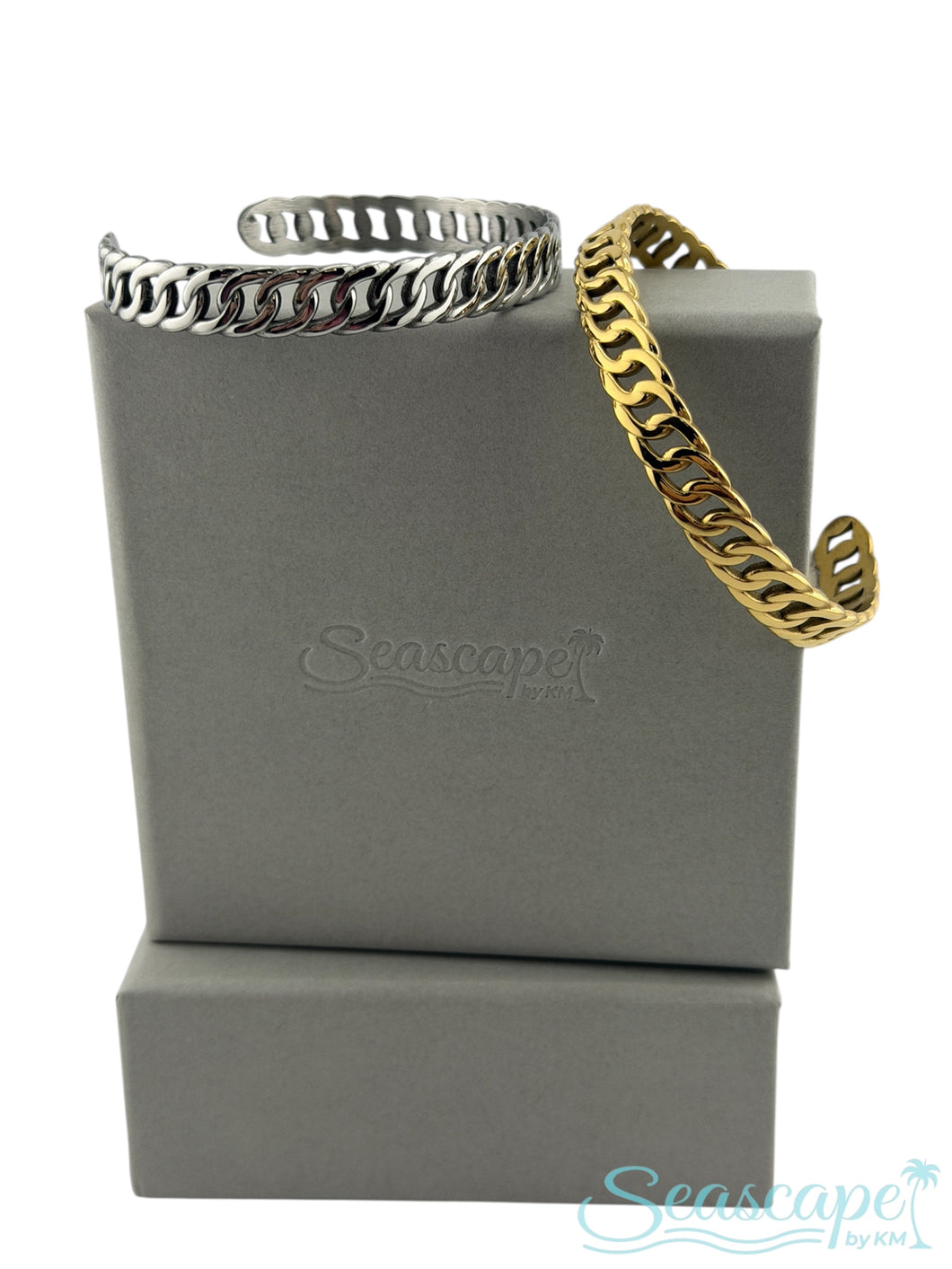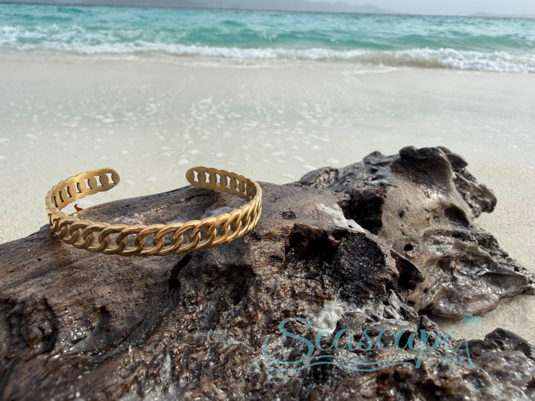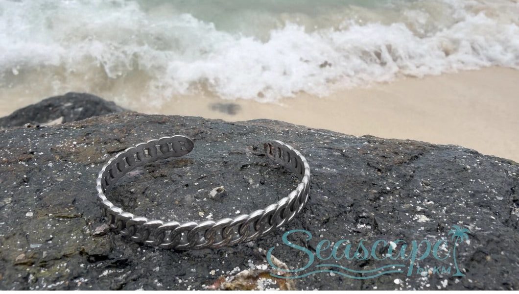 This cuff bracelet features a fashionable stainless steel solid metallic flat curb chain style. Unveil a new dimension of sophistication as this cuff bracelet effortlessly enhances the elegance of your ensemble.