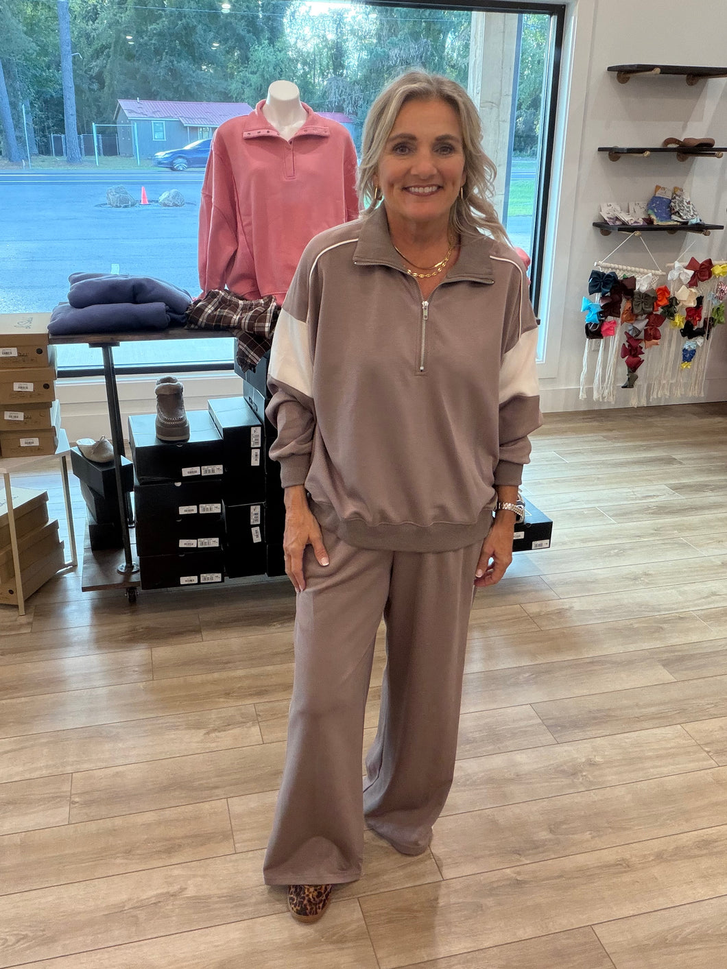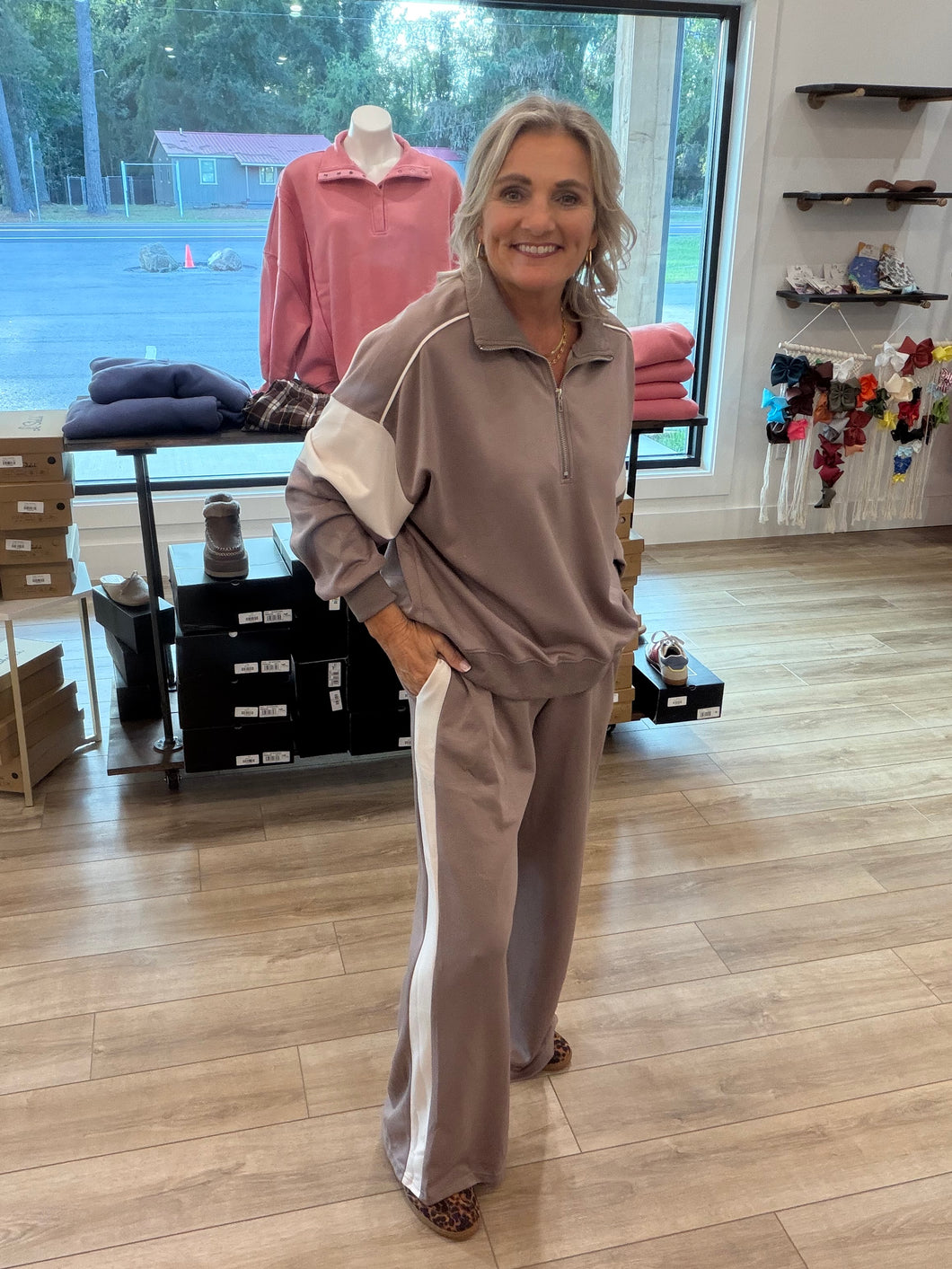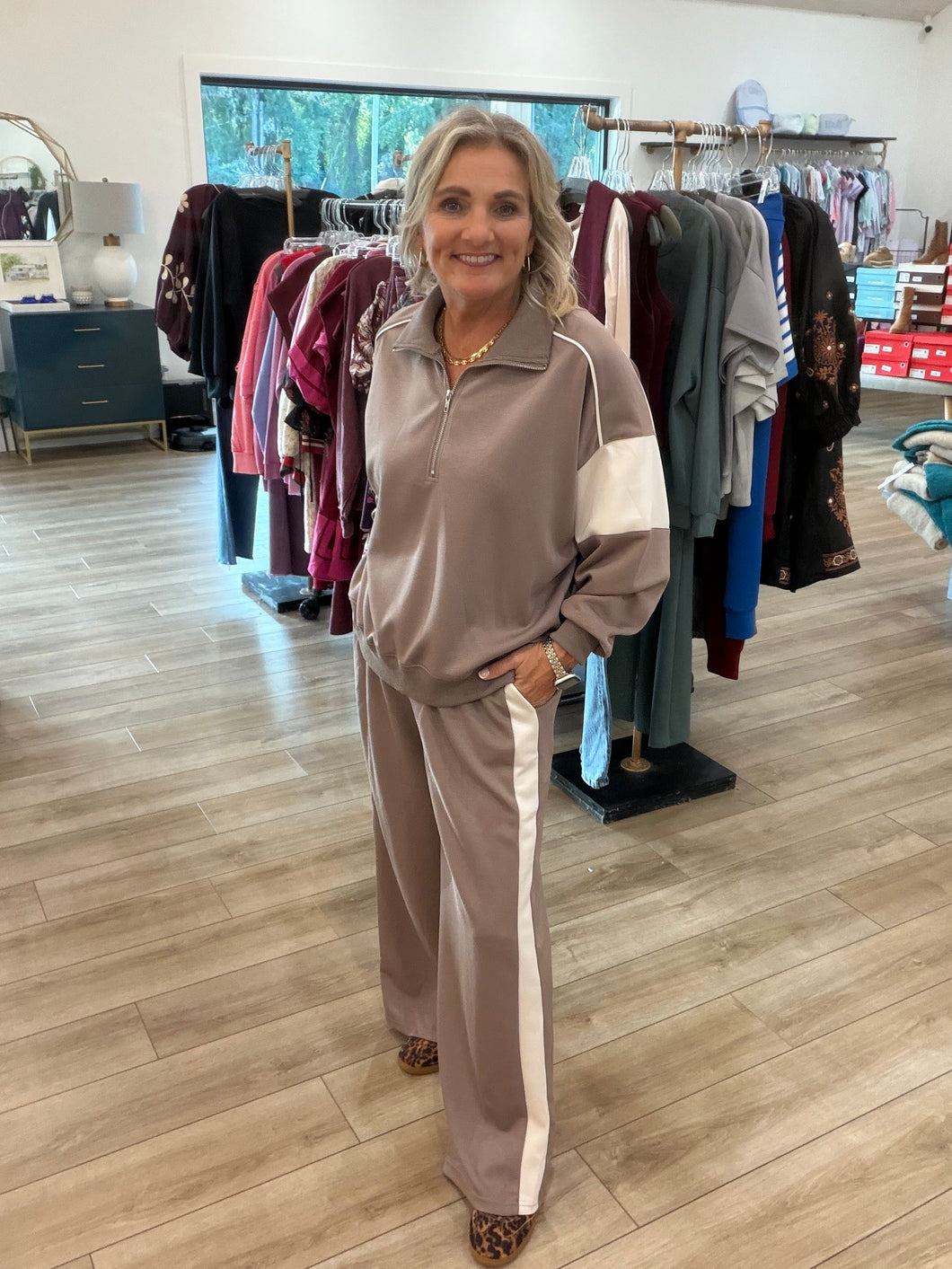 Experience the perfect blend of comfort and style with this long sleeve half-zip knit pullover, featuring eye-catching contrast detailing. Paired with matching elastic waist pants, this set offers a sleek, coordinated look that moves effortlessly from relaxing at home to casual outings. Crafted from soft, breathable fabric, it ensures all-day comfort and easy wear. Upgrade your wardrobe with this versatile and stylish ensemble designed to keep you cozy and confident.