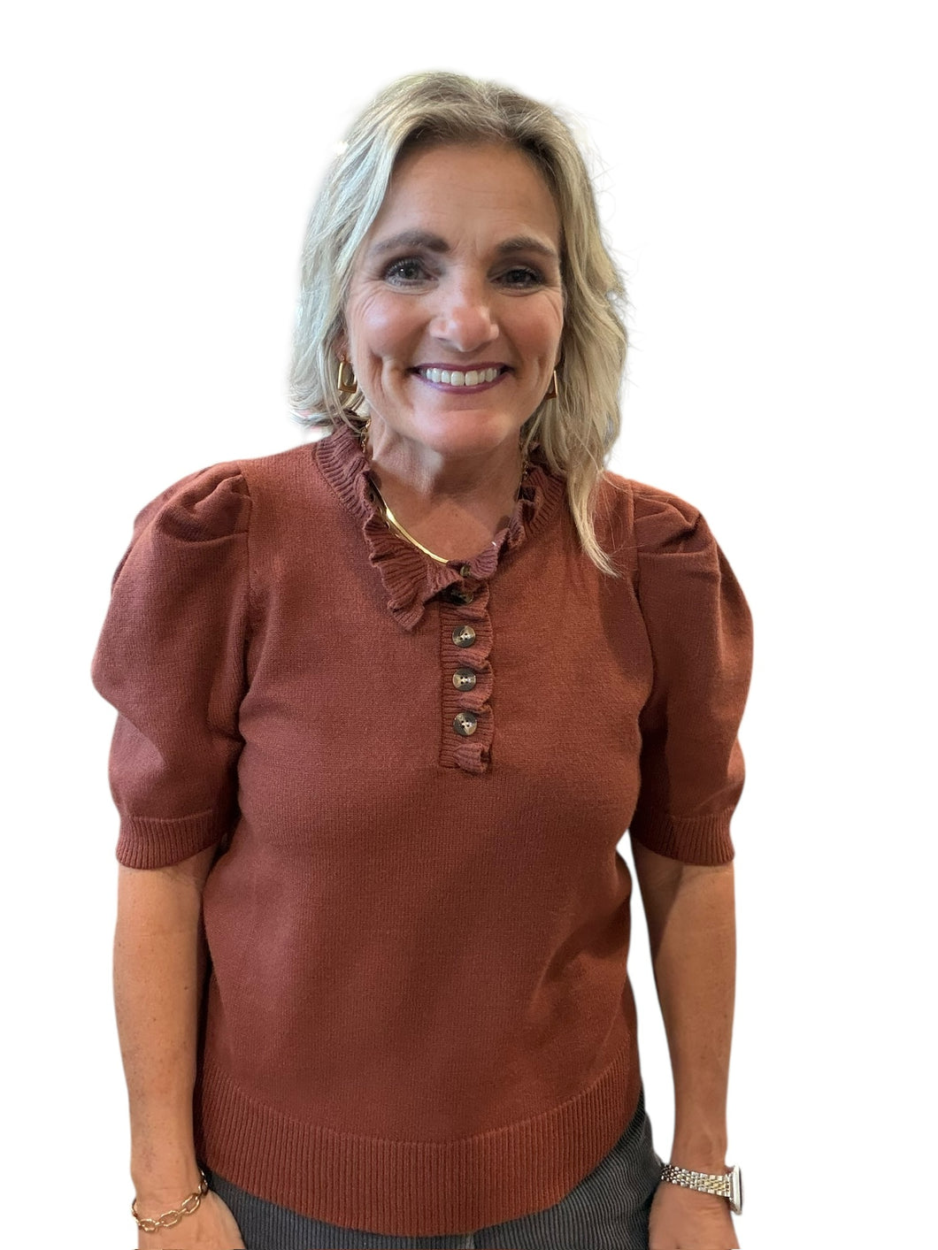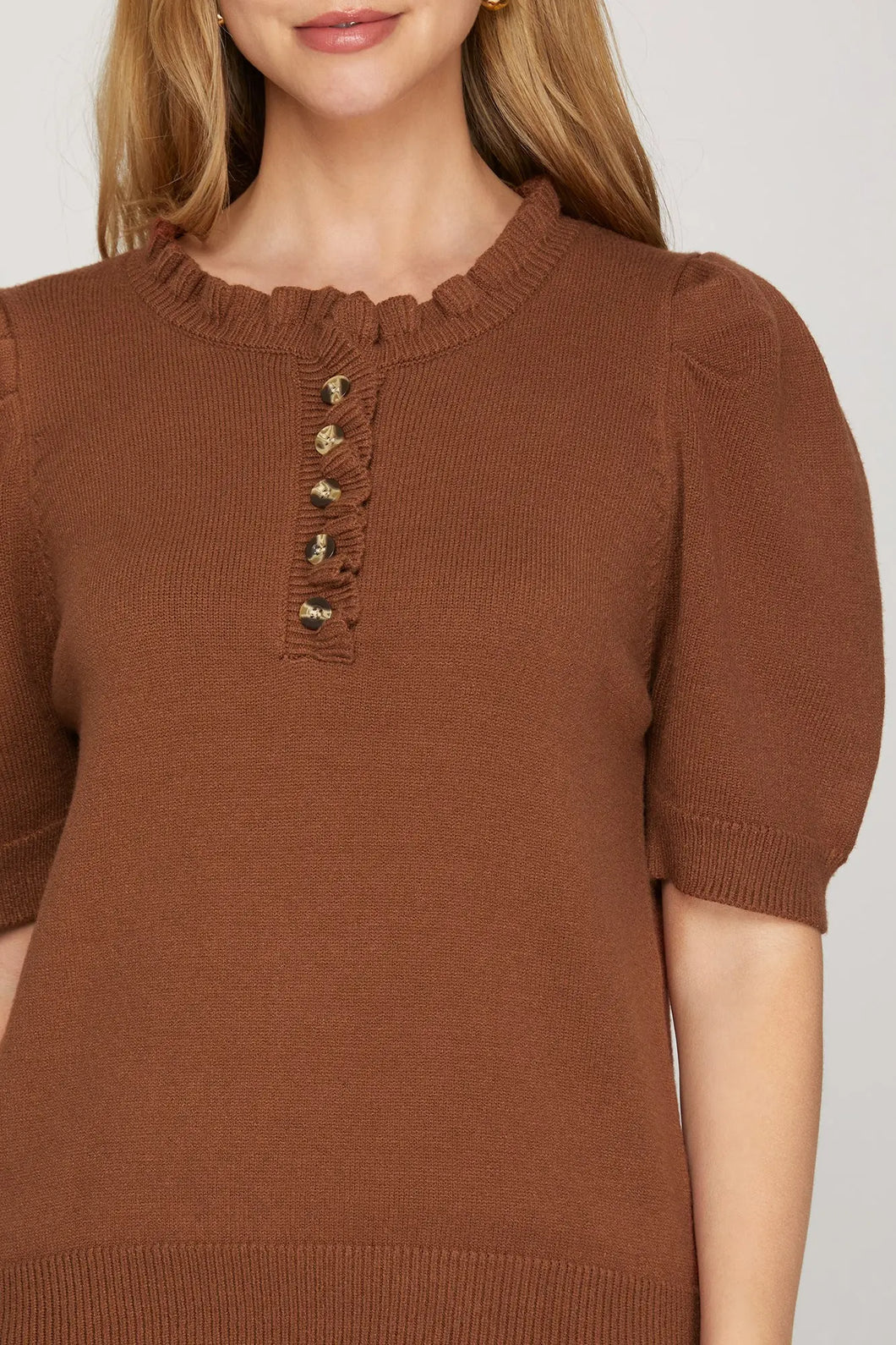 This short sleeve sweater top features a delicate ruffled neckline that adds a charming touch to your outfit. Its soft fabric ensures comfortable wear, making it perfect for both casual days and dressier occasions. Embrace this pretty and feminine piece.