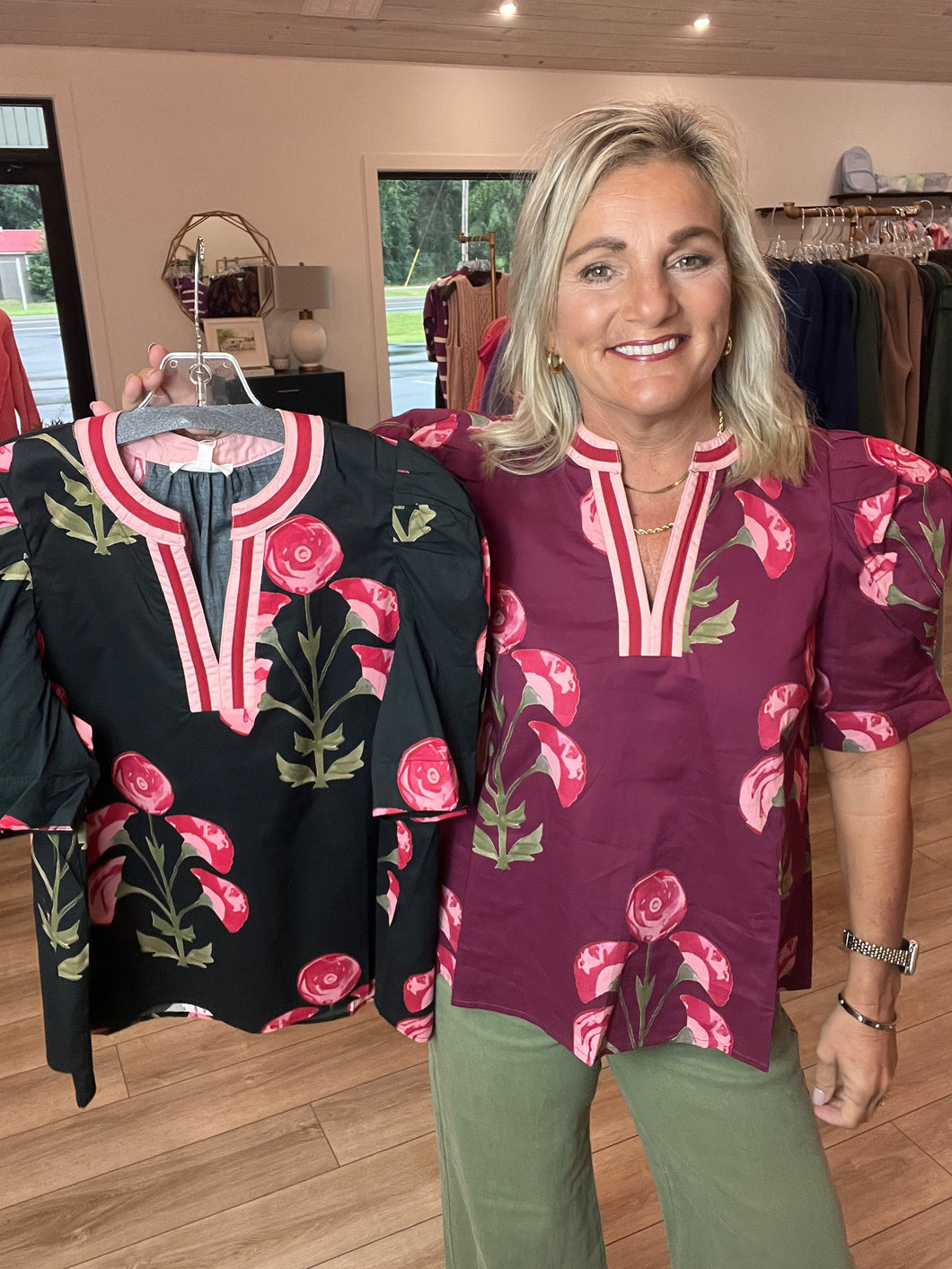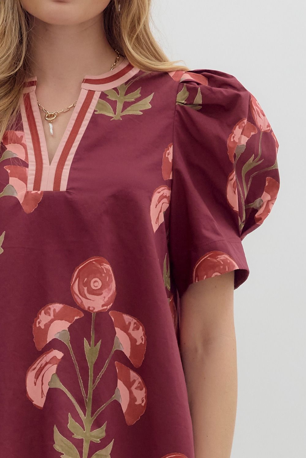 Floral print structured shoulder puff short sleeve top featuring multicolor band accent round V-neck.