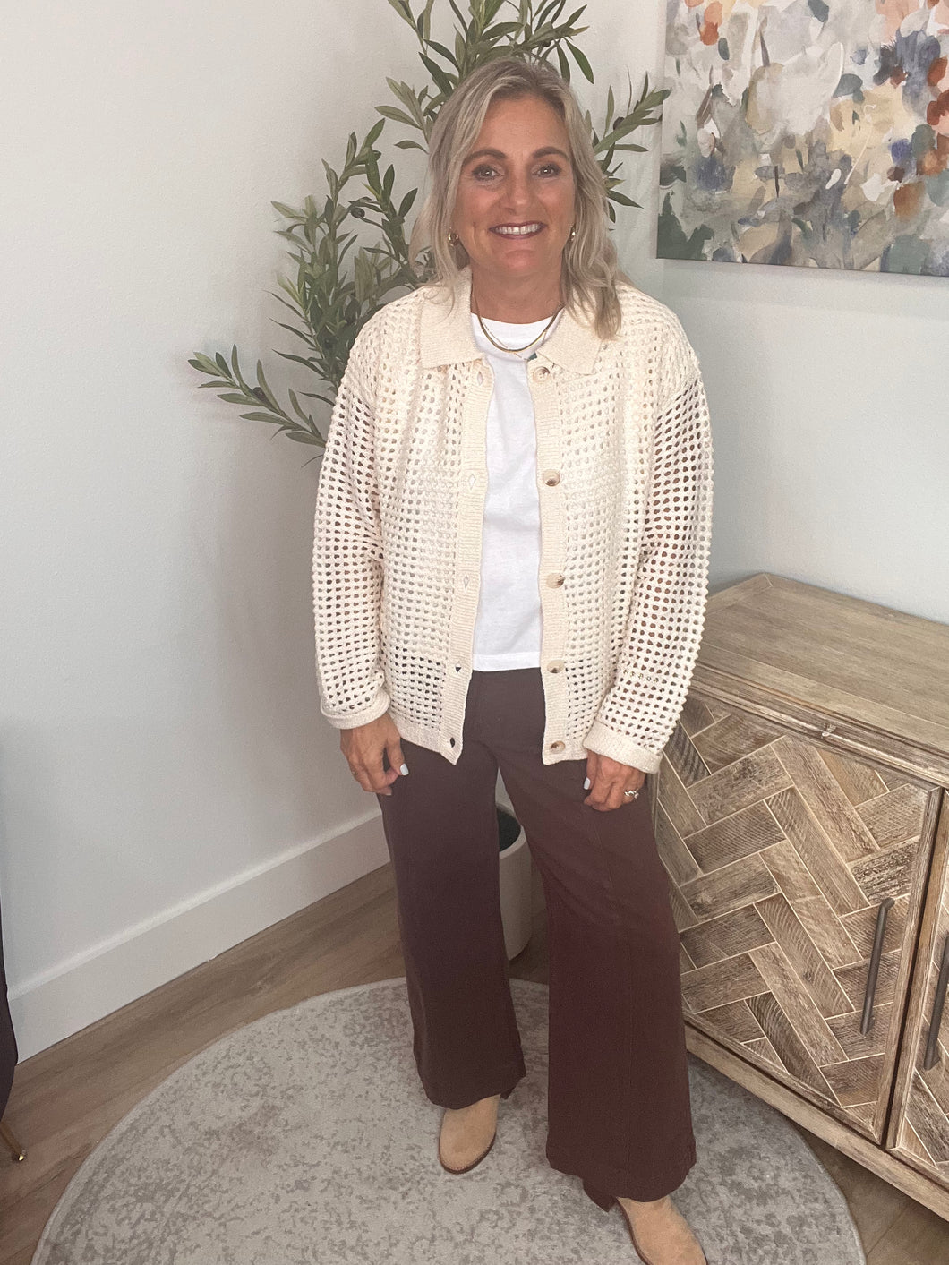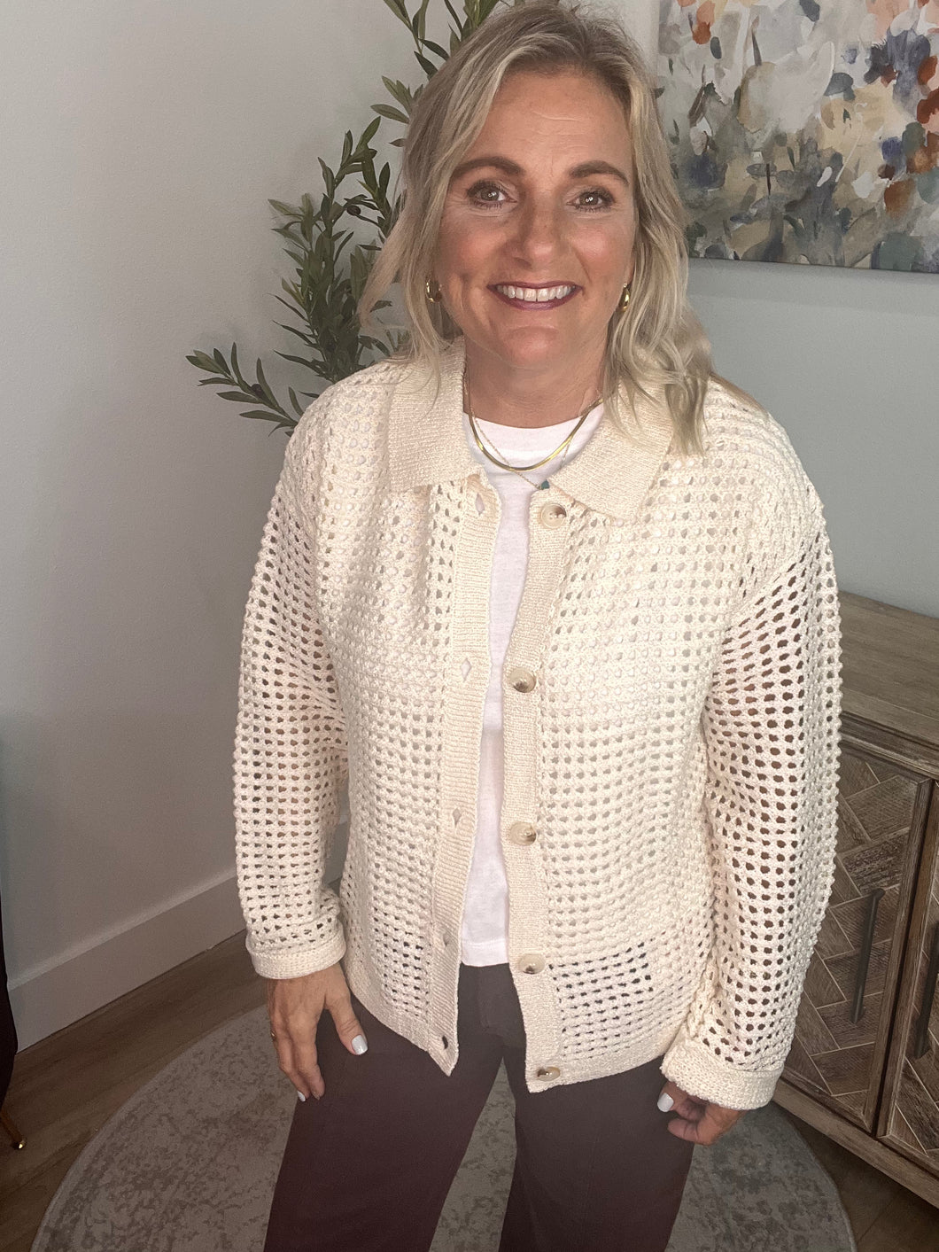 Crafted with care and attention to detail, this cardigan features an open stitch design that adds a touch of sophistication to your wardrobe.