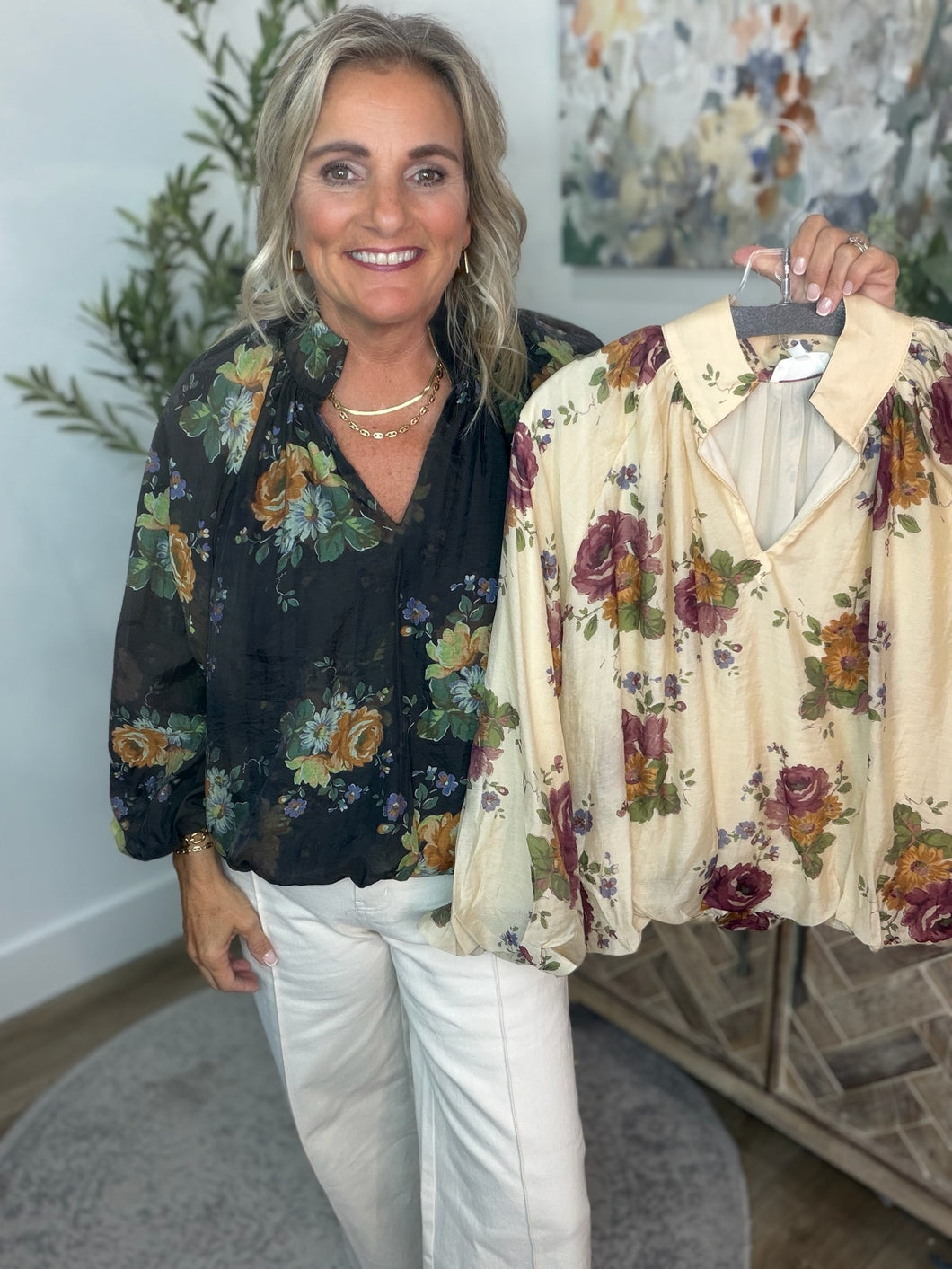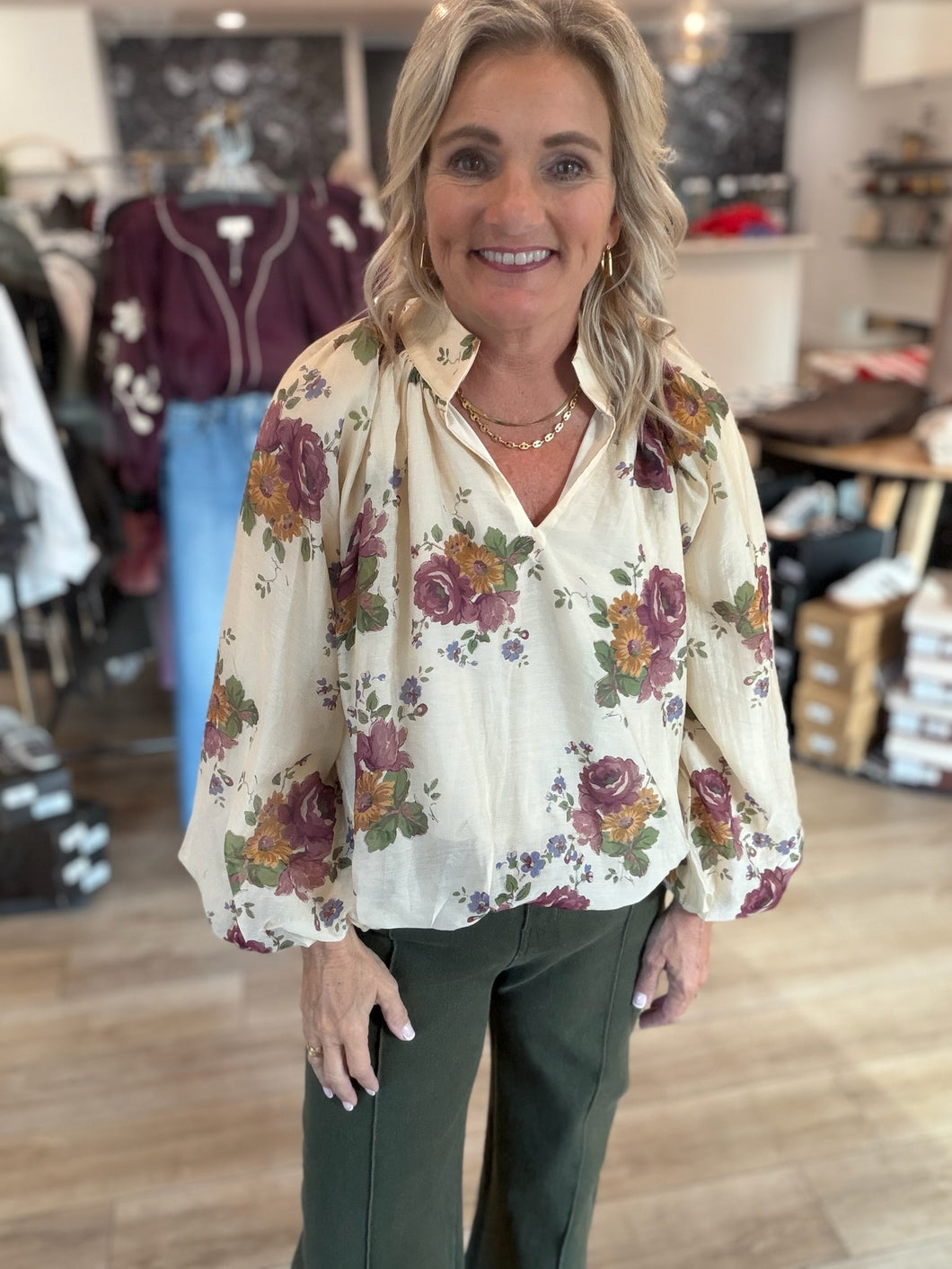 Floral print long puff sleeve top featuring shirring at neckline. Lined. Woven.