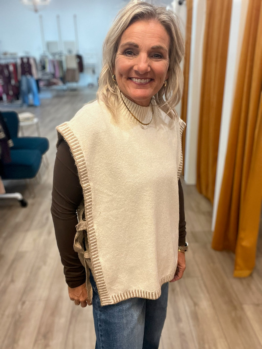 Elevate your layering game with this trendy knit sweater vest featuring a chic mock neck and eye-catching contrast side tie details. Perfect for adding a stylish twist to any outfit, its unique design blends comfort with contemporary flair for effortless cool.
