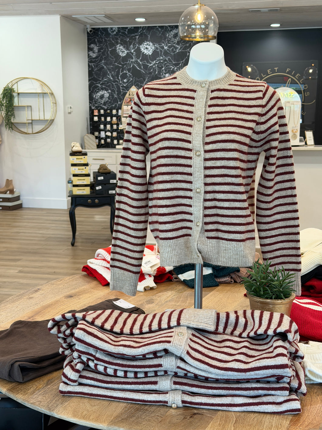 This striped button-up knit cardigan features a timeless crew neck and cozy long sleeves with ribbed cuffs for a comfortable fit. The classic stripe pattern adds a casual, laid-back vibe, while the button-up front makes it easy to layer over your favorite tops. Perfect for everyday wear, it combines style and comfort effortlessly.