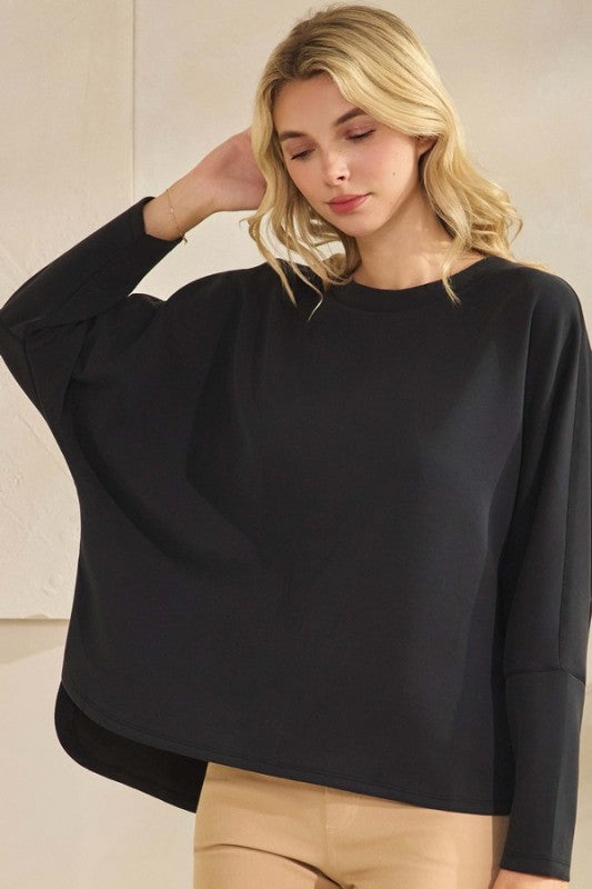 The New Horizon 3/4 Sleeve top features soft scuba fabric with a delightful brushed feel, offering a cozy touch all day long. Its easy fit ensures comfortable wear for any occasion, making it a perfect addition to your wardrobe with a cute, relaxed vibe.