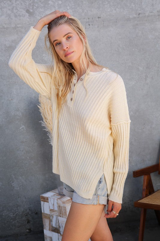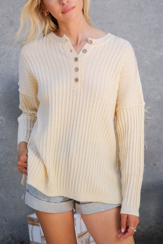 Stay cozy and chic in our Long Sleeve Round Neck Half Button-Down Oversized Henley Ribbed Sweater. This oversized henley combines relaxed style with thoughtful detailing: a round neckline and half-button front add a touch of casual charm, while ribbed texture brings a flattering, stretchy fit.