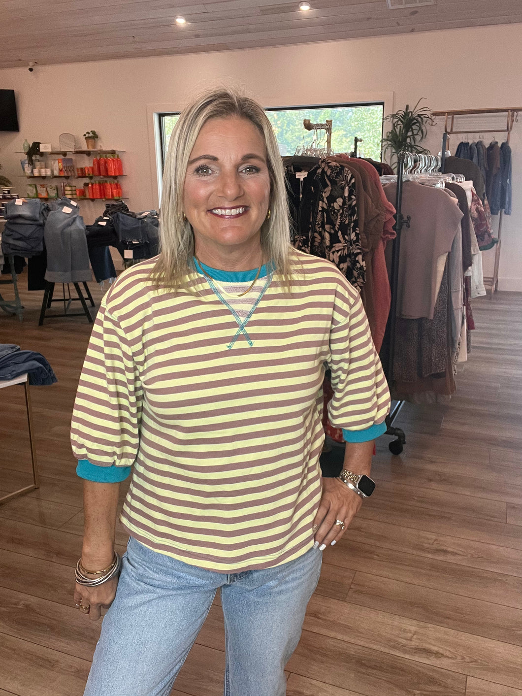 This casual stripe top features playful 3/4 sleeves and a charming V-notched neckline, adding a touch of whimsy to your everyday look. Crafted from a soft blend of 51% cotton and 49% polyester, it promises comfort and easy care.