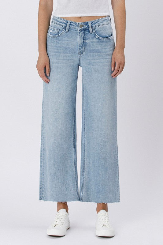 HIGH RISE WIDE LEG JEANS COMFORT STRETCH DENIM, HIGH RISE WAIST, CLEAN CUT RAW HEM, CROPPED LENGTH, WIDE LEG JEANS F. RISE: 10" / INSEAM: 26 1/2"