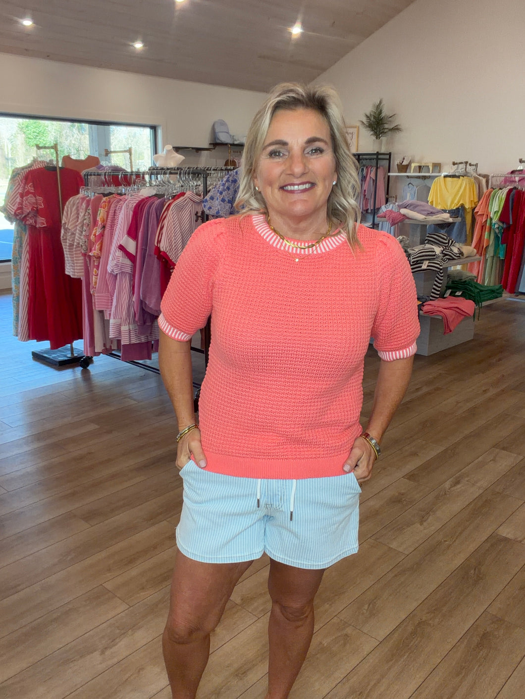 HIGH RISE DRAWSTRING STRIPED SHORTS COMFORT STRETCH DENIM, HIGH RISE WAIST, SLANT POCKETS, ELASTIC WAISTBAND WITH DRAWSTRING, FINISHED HEM, STRIPED SHORTS F. RISE: 10 1/2" / INSEAM: 4" / LEG OPENING: 24 3/4" MODEL IS 5'10" WEARING A SIZE SMALL