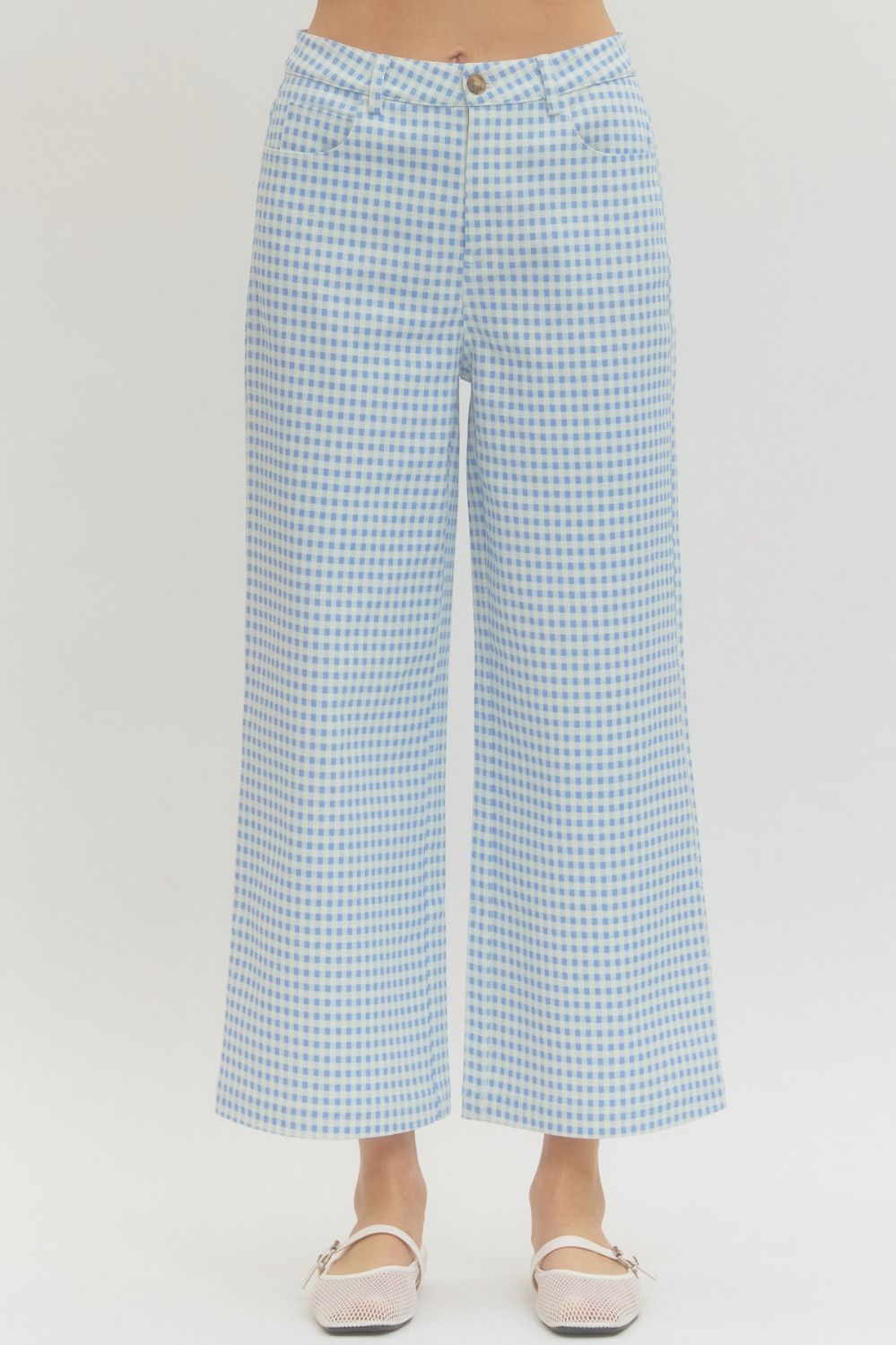Gingham straight leg pants featuring button closure at front. Zip-fly. Front and back pockets.