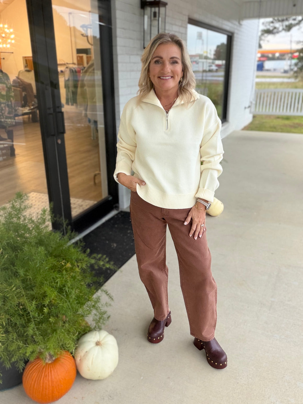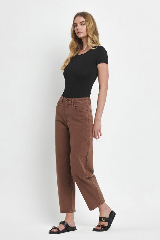 HIGH RISE BROWN SLIM BARREL JEANS COMFORT STRETCH DENIM, SUPER HIGH RISE WAIST, FINISHED HEM, CROPPED LENGTH, SLIM BARREL JEANS