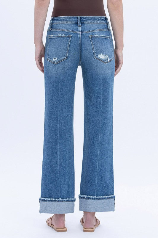 MID RISE CUFFED ANKLE SLIM WIDE JEANS COMFORT STRETCH DENIM, MID RISE WAIST, DISTRESSED DETAIL, SINGLE CUFF HEM, ANKLE LENGTH, SLIM WIDE JEANS