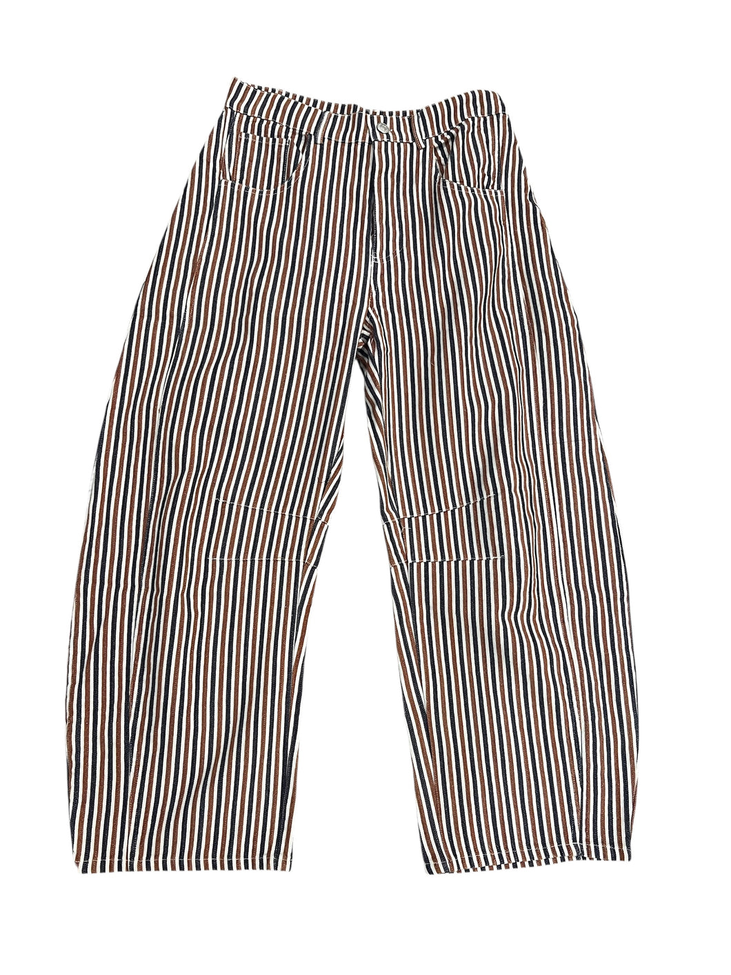 These stripe barrel style denim pants blend comfort and style effortlessly. Featuring a relaxed barrel silhouette with subtle stripe detailing, they offer a modern twist on classic denim. Perfect for those seeking a distinctive addition to their denim collection.