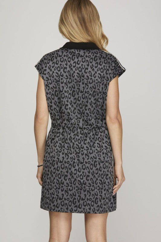 This adorable short sleeve knit mini dress features a playful leopard print with a trendy half zip and a contrasting band for a fun, sporty touch. The drawstring elastic waist band lets you adjust the fit while adding a flattering shape. Perfect for casual days when you want to look effortlessly cute and stylish.