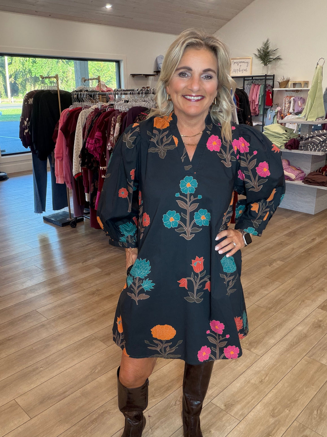 Floral print 3/4 sleeve mini dress featuring pleated shoulder detail and V-neck. Side pockets. Lined. Woven.