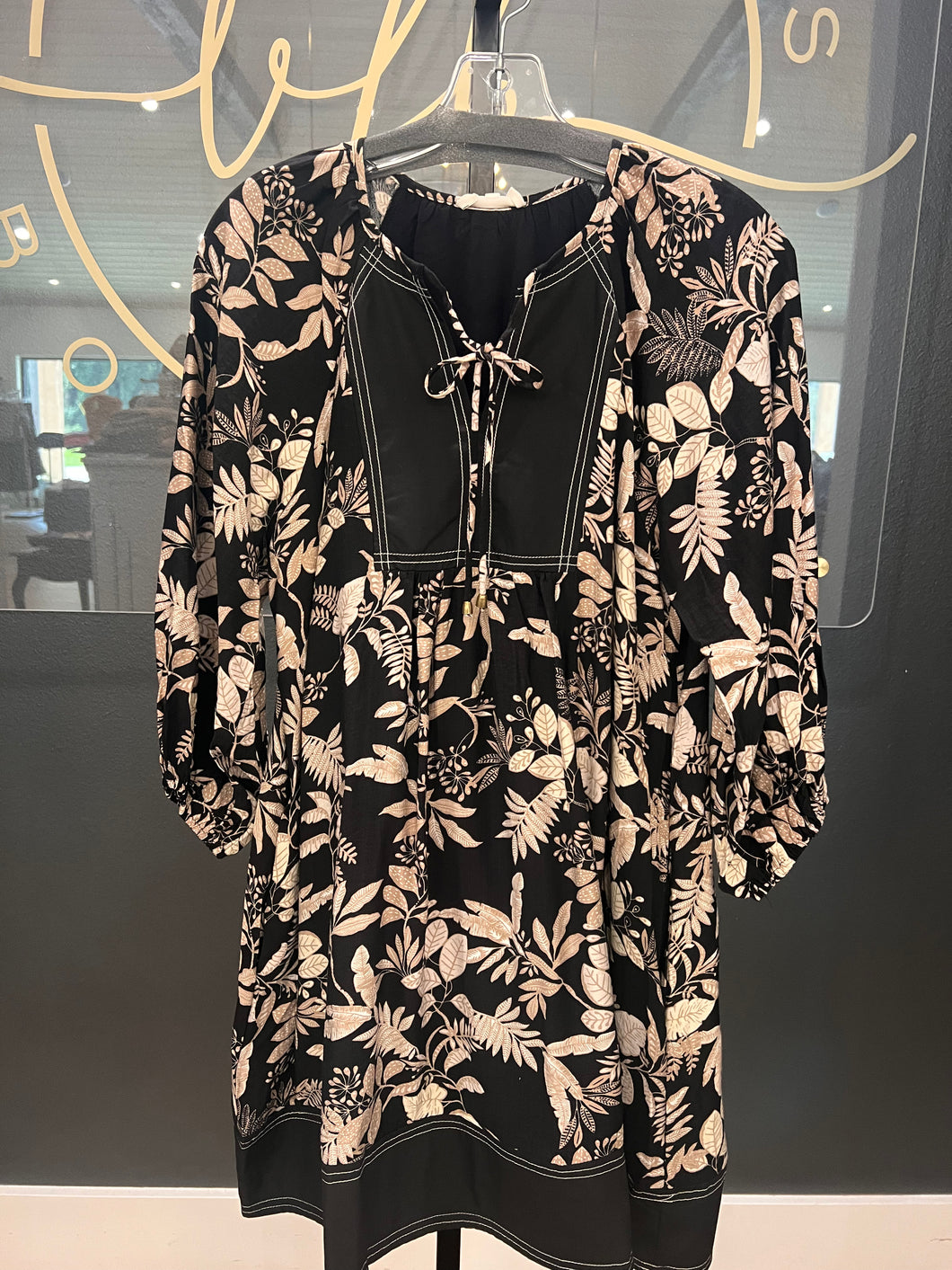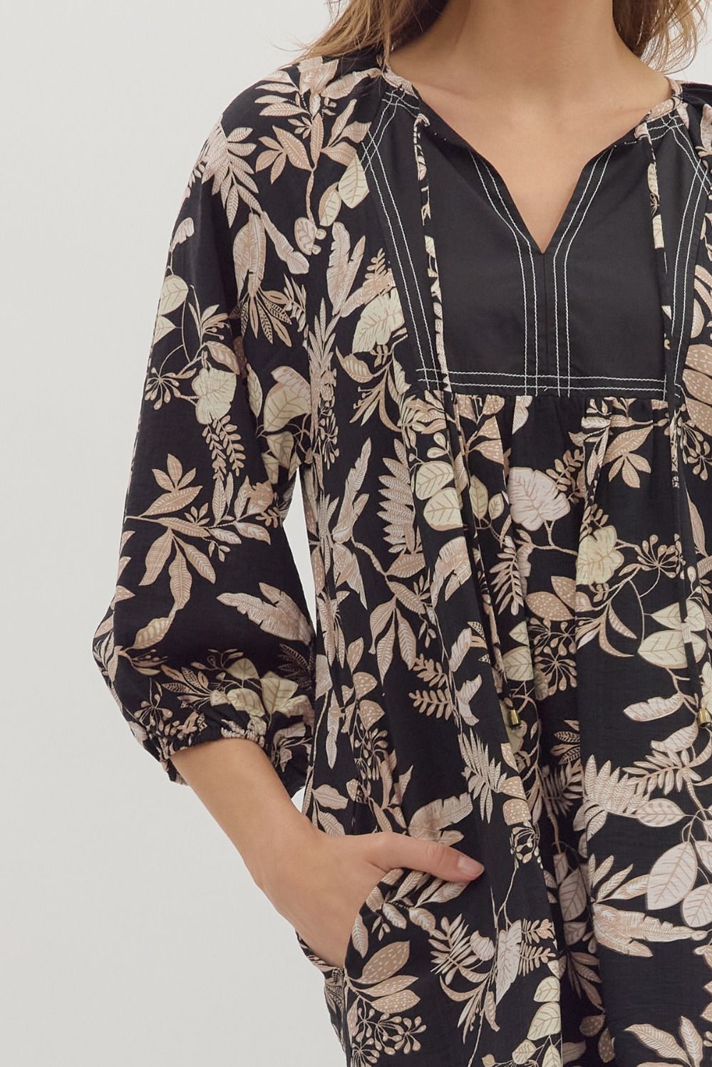 Botanical print ¾ sleeve featuring contrast accent front panel and hem finish. Pockets at sides. Lined. Woven.