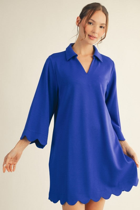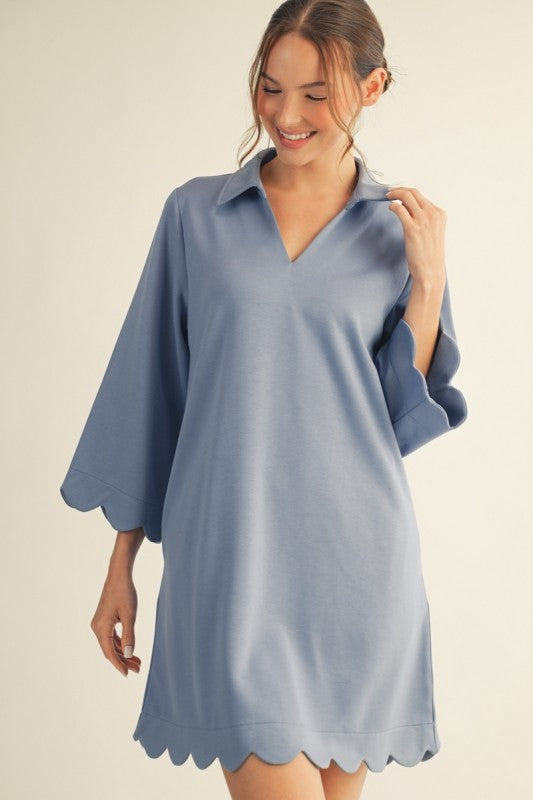 Crafted from soft, touchable fabric, it features three-quarter sleeves that strike the perfect balance between coverage and breathability. The scalloped hem adds a delicate, feminine detail that elevates the simple silhouette, while functional side pockets provide practical style. Perfect for casual outings or dressed up for special occasions, this versatile piece transitions beautifully through any season.