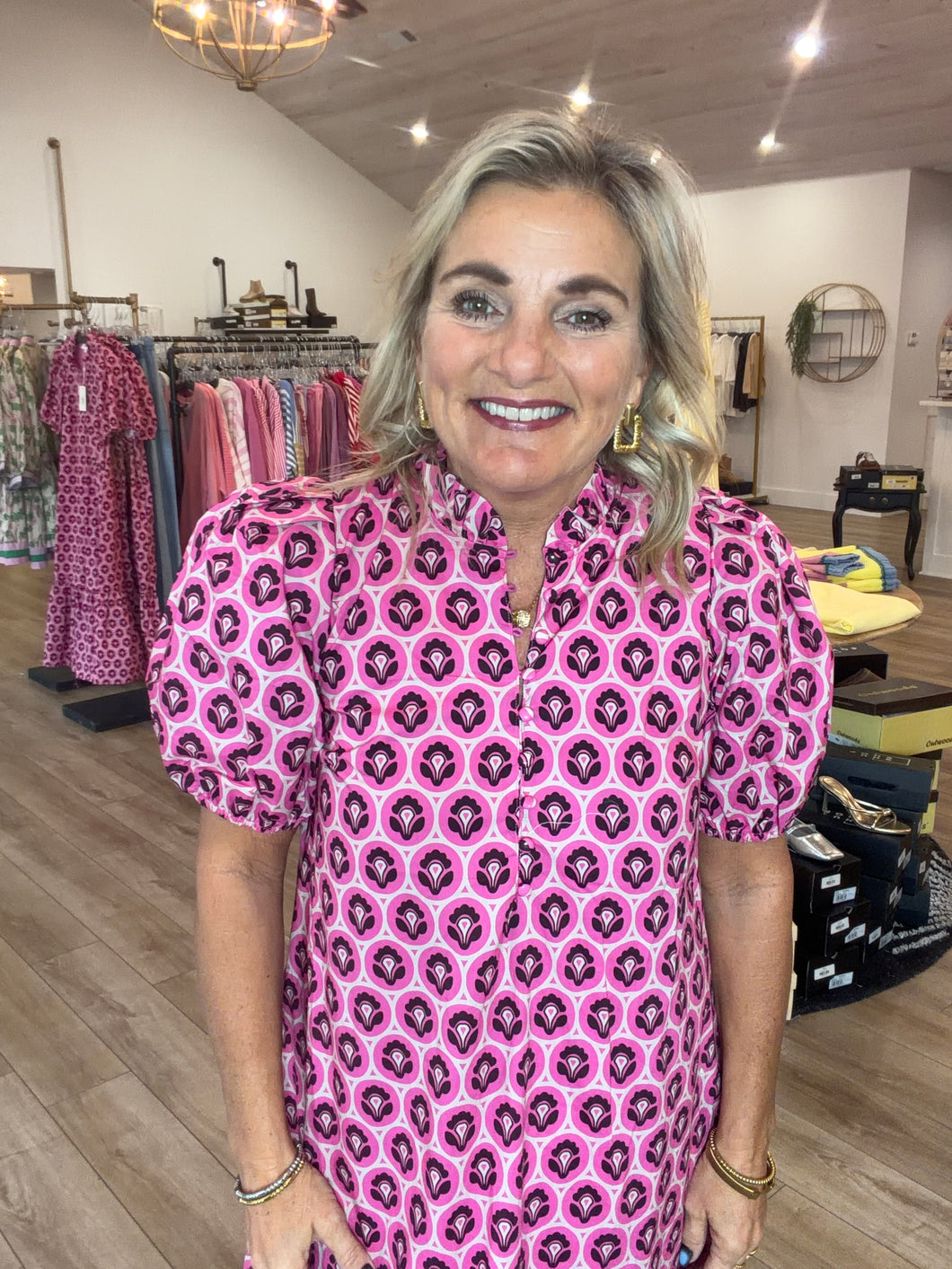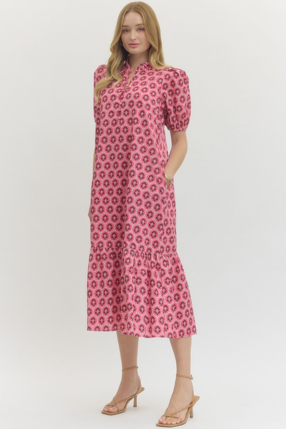 This printed midi dress brings together romantic details and practical design. Soft puff sleeves frame the shoulders while a ruffled mock neck adds feminine charm. The coordinating ruffle hem creates movement and dimension as you walk. Front button closure allows for easy styling, and functional side pockets keep essentials within reach. The lined interior ensures a refined, comfortable wear from morning to evening.