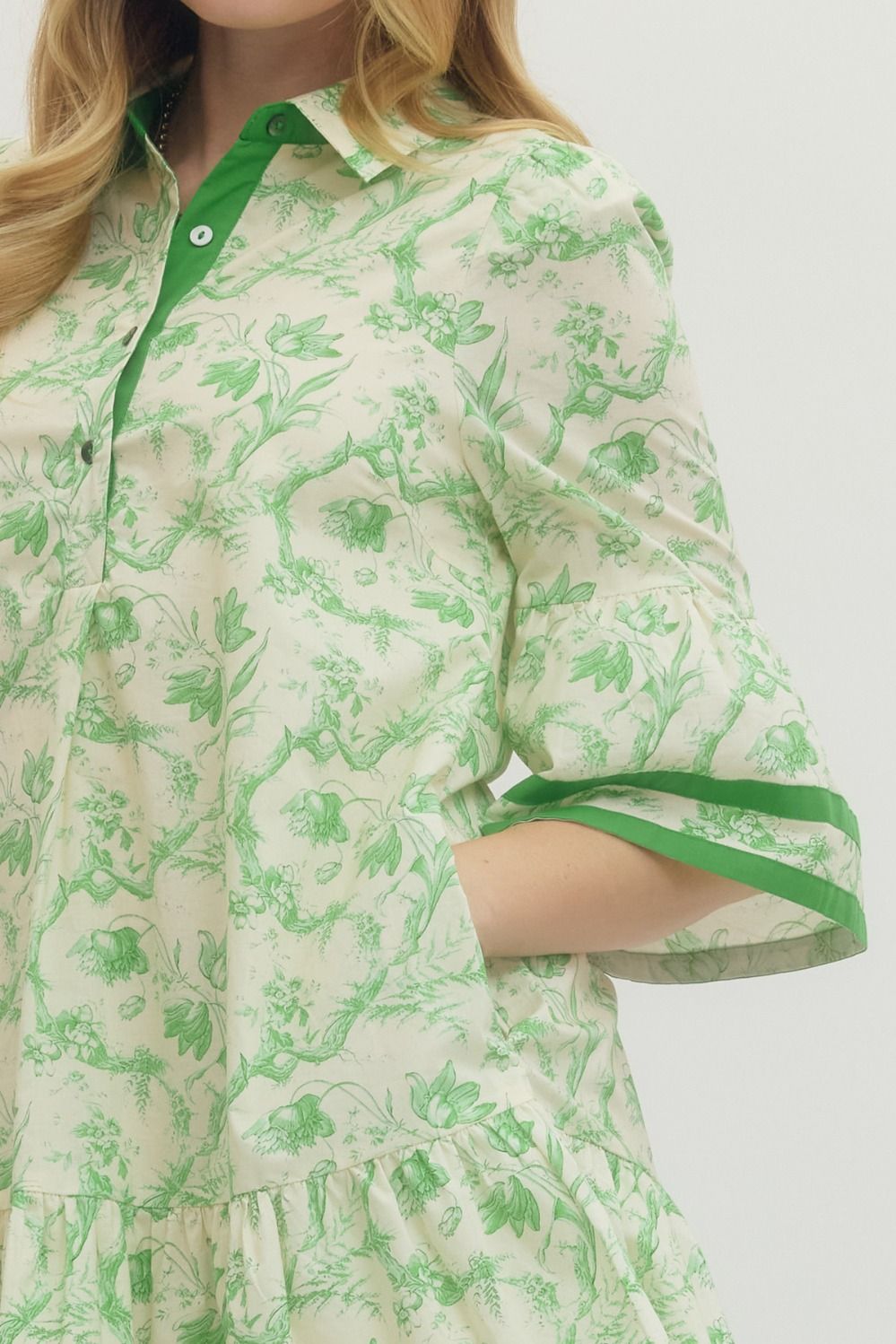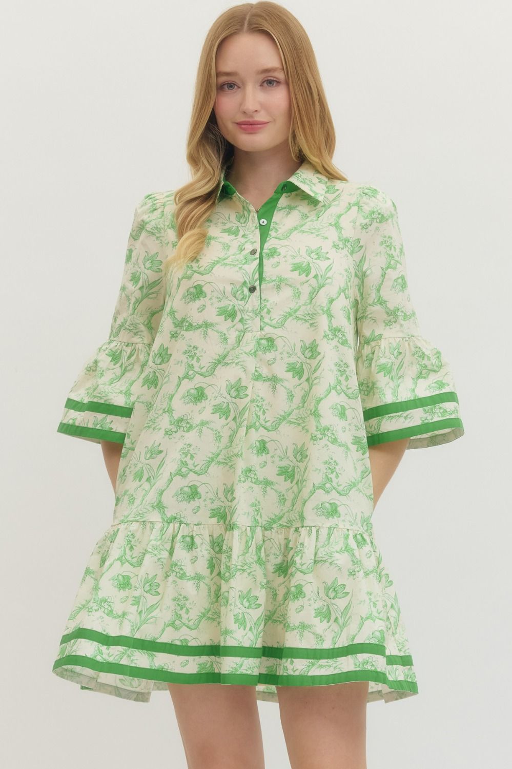 This refined toile print dress, designed for effortless sophistication. The three-quarter sleeves and contrast binding at the neckline, cuffs, and hem create a polished silhouette, while the front button closure adds vintage-inspired charm. Practical side pockets and a fully lined interior ensure both style and comfort. Perfect for transitional seasons and versatile enough to dress up or down.