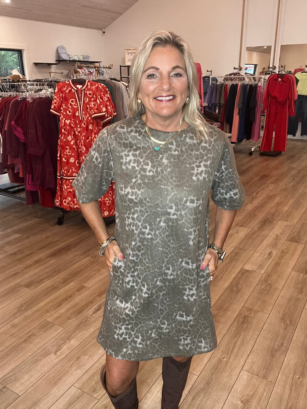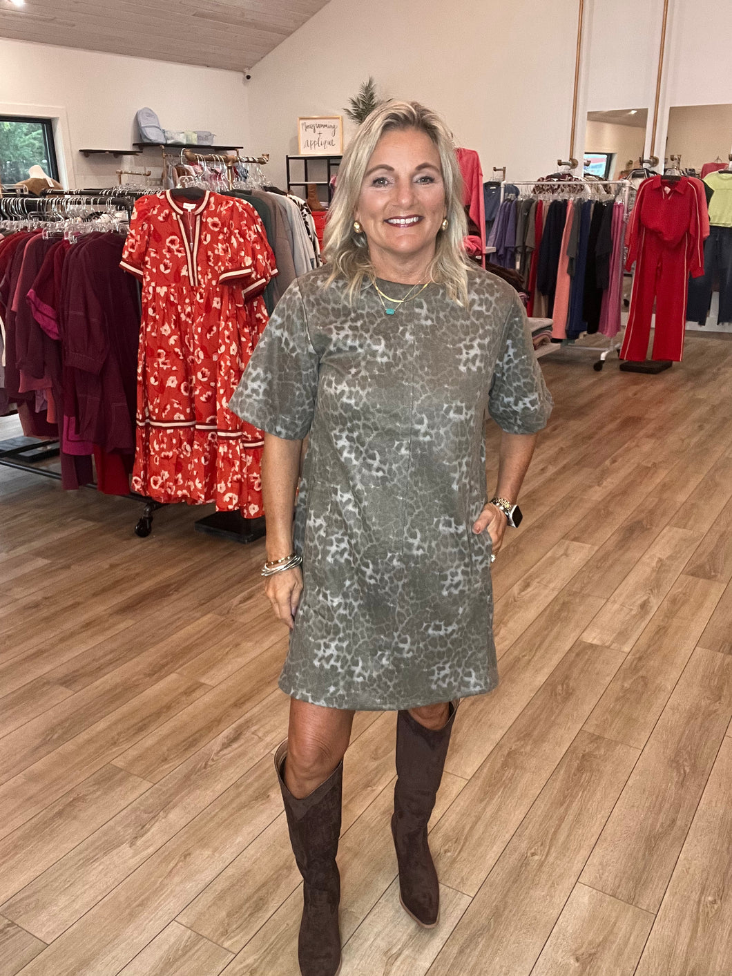 Make animpression in this short sleeve leopard print dress with a soft, sueded texture. Its striking pattern and luxurious feel combine to elevate your look with fearless style and confident comfort.