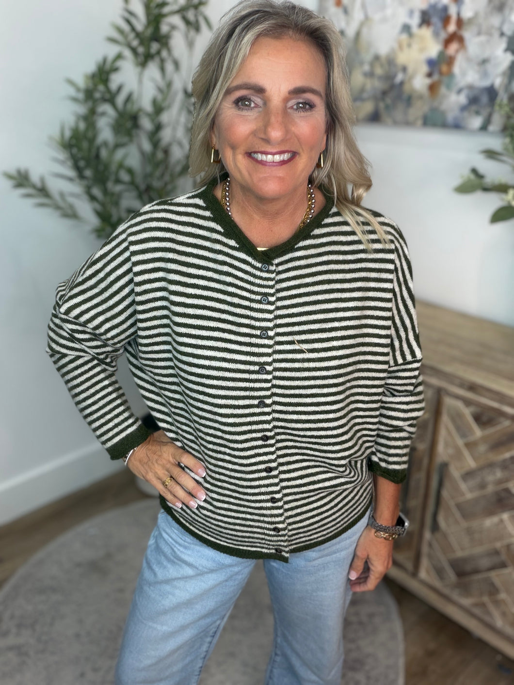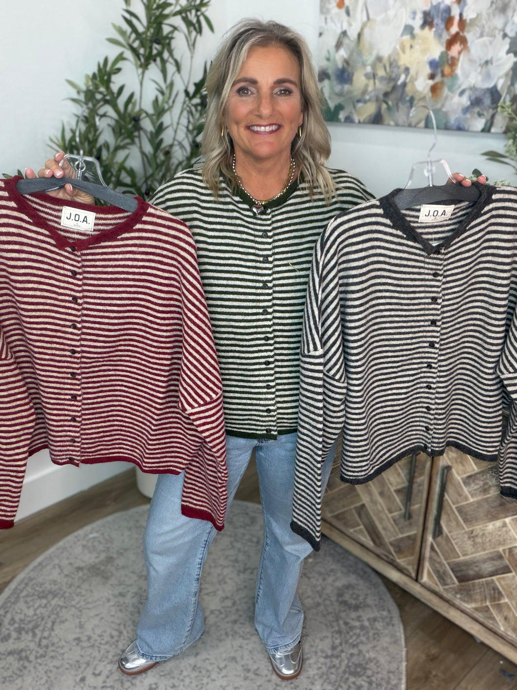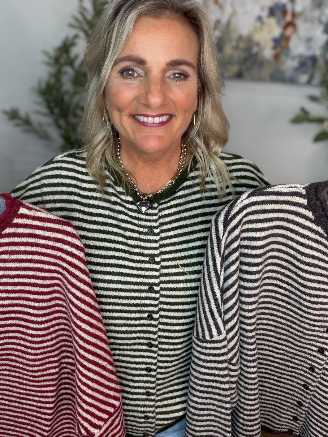 This cozy knit cardigan features a charming stripe pattern and a flattering round neckline. With long sleeves and a relaxed drop shoulder design, it offers a comfy, casual vibe. The button-down front and raw edge details add an adorable touch, making it perfect for layering on cool days.