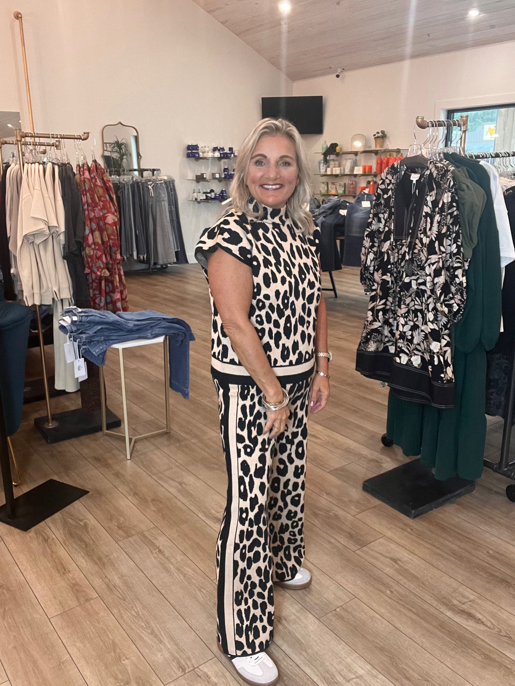 This animal print mock neck sweater knit pullover pairs effortlessly with matching pants featuring sleek side stripe detailing. Crafted for a refined yet bold look, this set combines comfort with a timeless pattern, making it ideal for stylish, elevated wear.