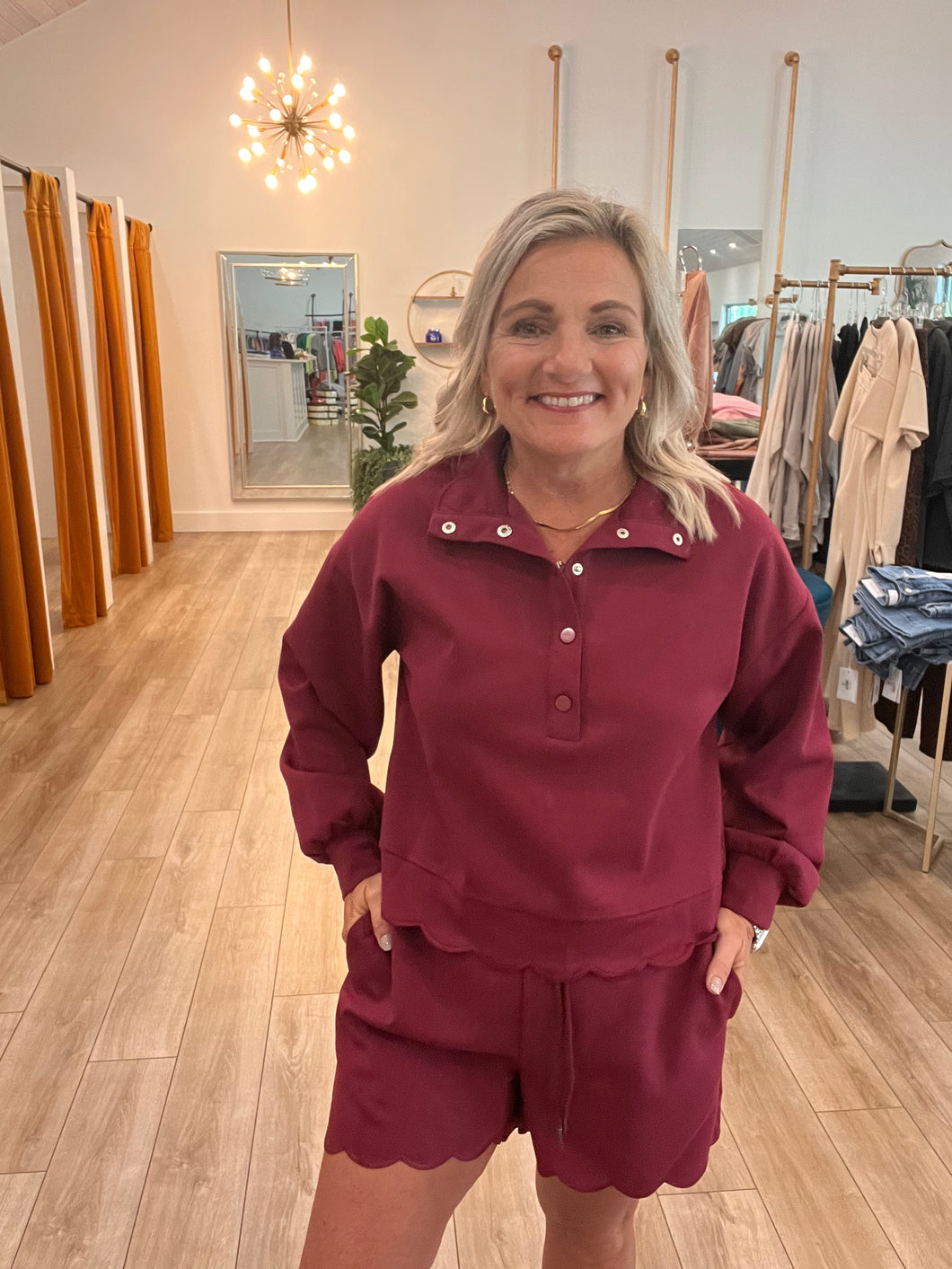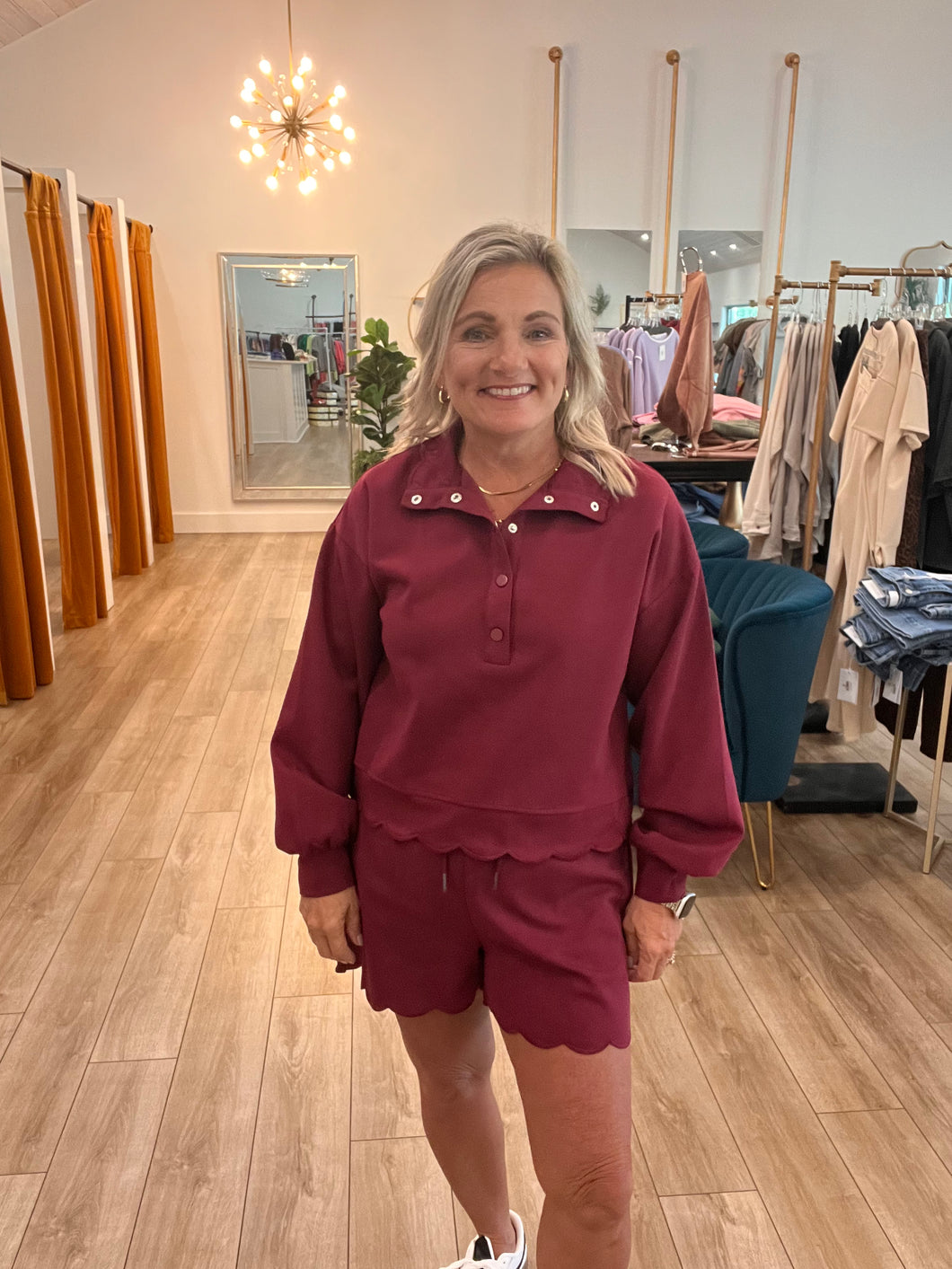 This chic solid long sleeve pullover, featuring a snap button closure and delicate embroidered scallop edges that add a touch of refined elegance. Paired seamlessly with scallop edge hem shorts designed with a comfortable elastic waist, this set balances style and ease for a polished yet relaxed look perfect for any occasion.