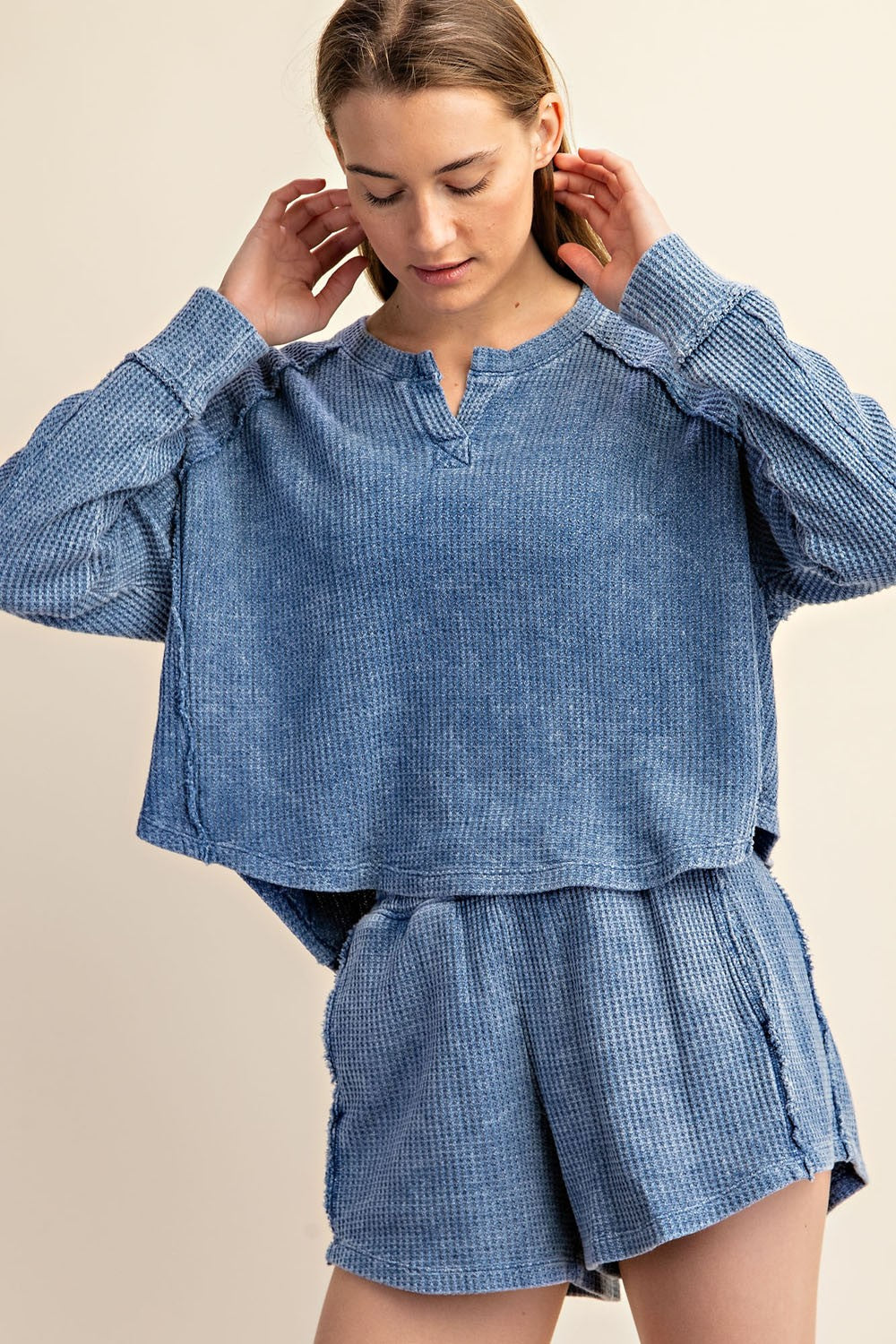 Made from mineral washed cotton waffle fabric, this cozy set includes a long sleeve pullover and matching shorts. Featuring raw edge details, this set offers a stylish, laid-back look that's perfect for relaxing at home or casual outings.