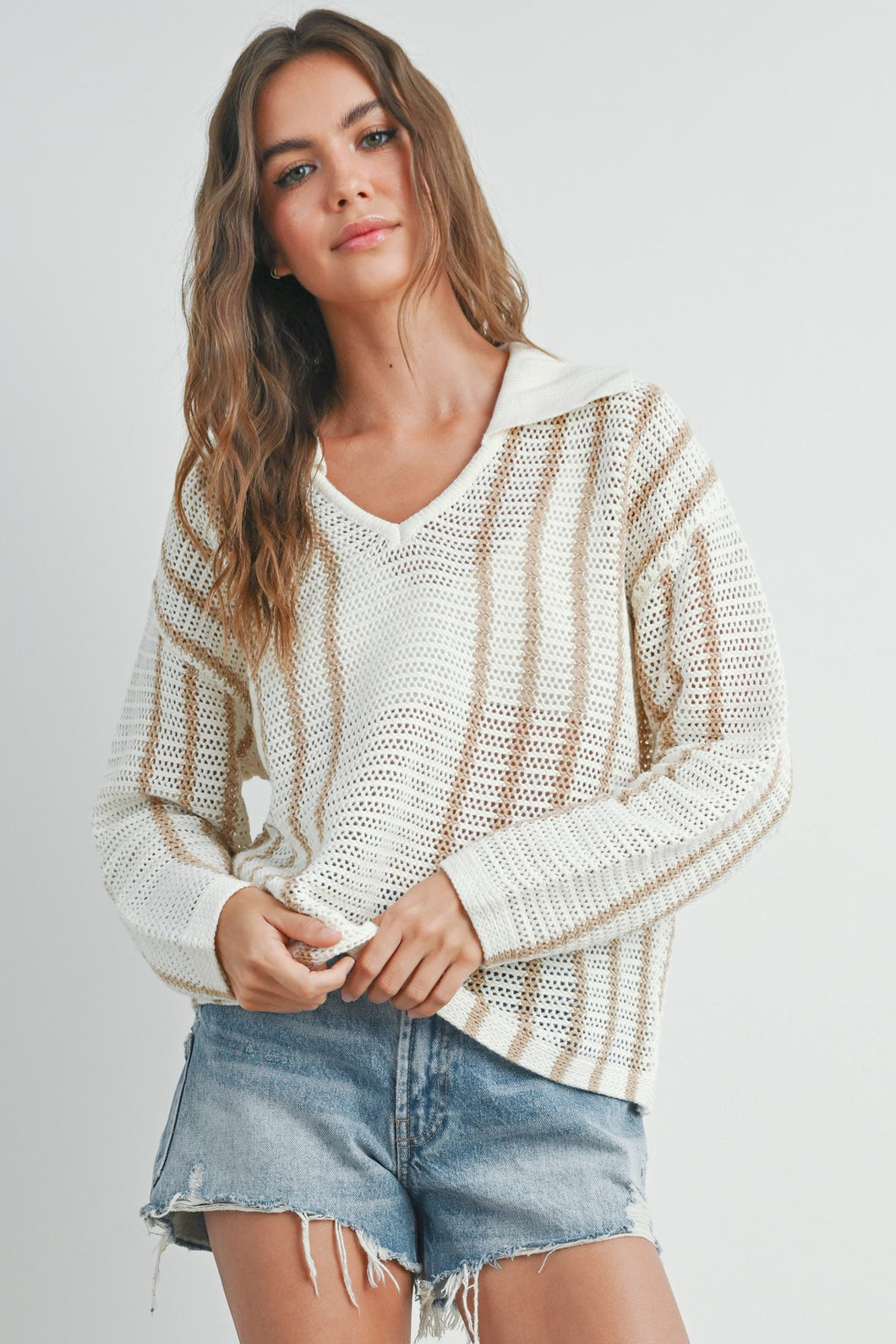 Introducing our Striped Knit Sweater with Collar, a cozy yet stylish essential for your wardrobe. This sweater features classic stripes in a timeless design, adding a touch of sophistication to your look. With its soft knit fabric and comfortable collar, it's perfect for keeping you warm and stylish on chilly days. Pair it with your favorite jeans for a casual yet put-together ensemble, or layer it over a button-down shirt for a preppy vibe. Versatile and easy to style, this striped knit sweater is a must-have addition to any closet.
