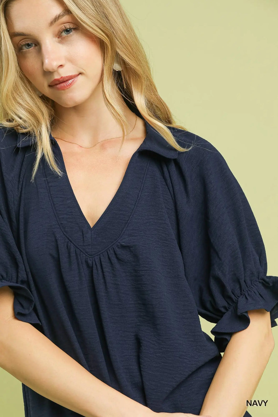 Relaxed comfort meets timeless style in this easy-fit top featuring a flattering V-neckline with a soft collar detail. Short puff sleeves add a playful touch, while delicate ruffle trim along the edges brings feminine charm. Perfect for casual days when you want to look put-together without the fuss.