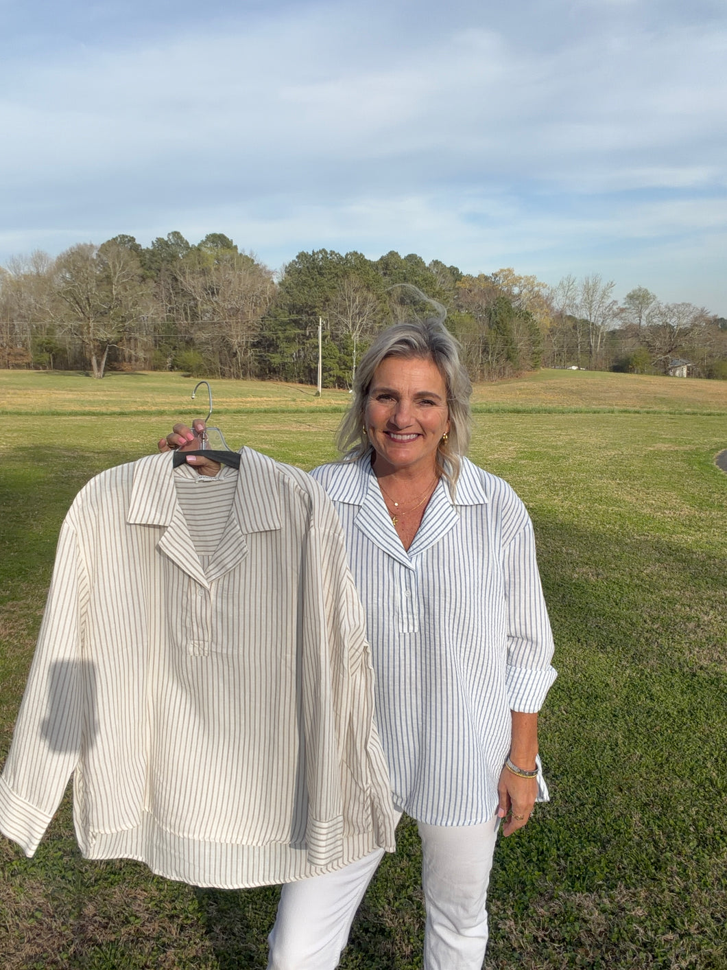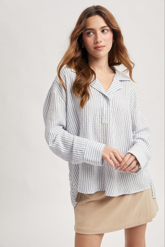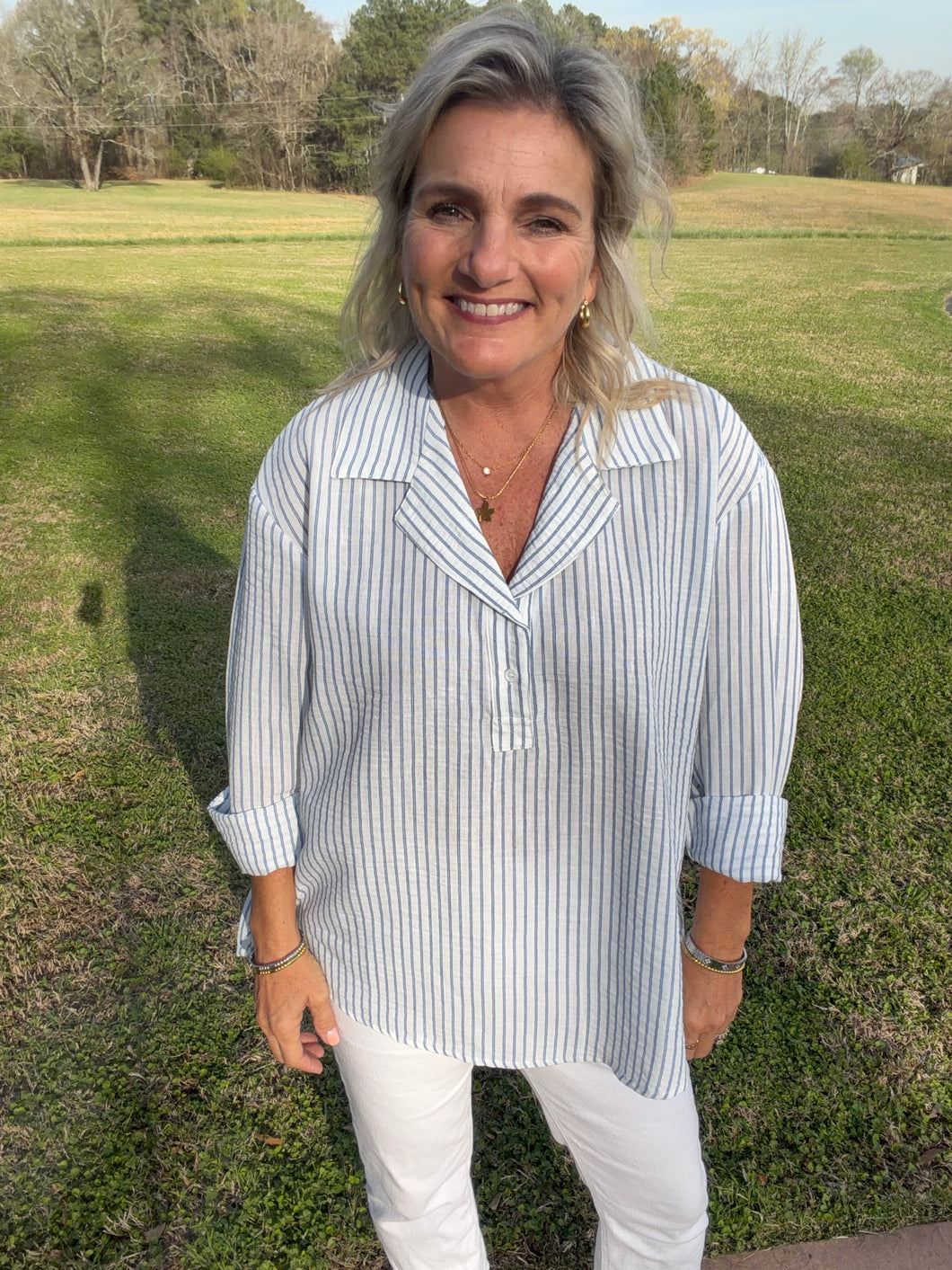 Get your laid back summery coastal vibe geared up and ready for this collared quarter button striped shirt.