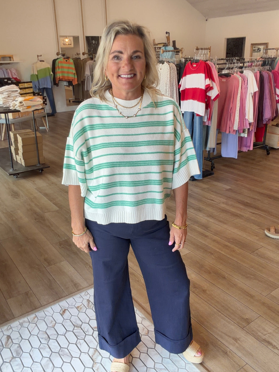 Effortlessly chic and wonderfully versatile, this drop half sleeve sweater top brings a touch of timeless elegance to your everyday wardrobe. The soft striped knit pattern adds visual interest while the relaxed round neckline keeps things casual and approachable. Perfect for layering or wearing solo, the gently dropped sleeves create a flattering silhouette that works beautifully with everything from jeans to skirts. Cozy, comfortable, and endlessly stylish—your new go-to piece awaits.