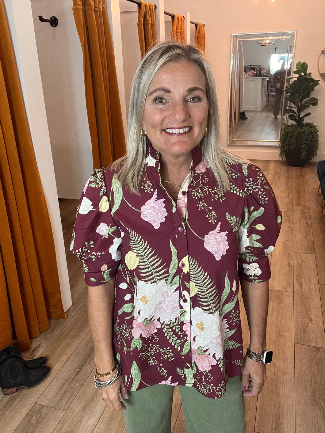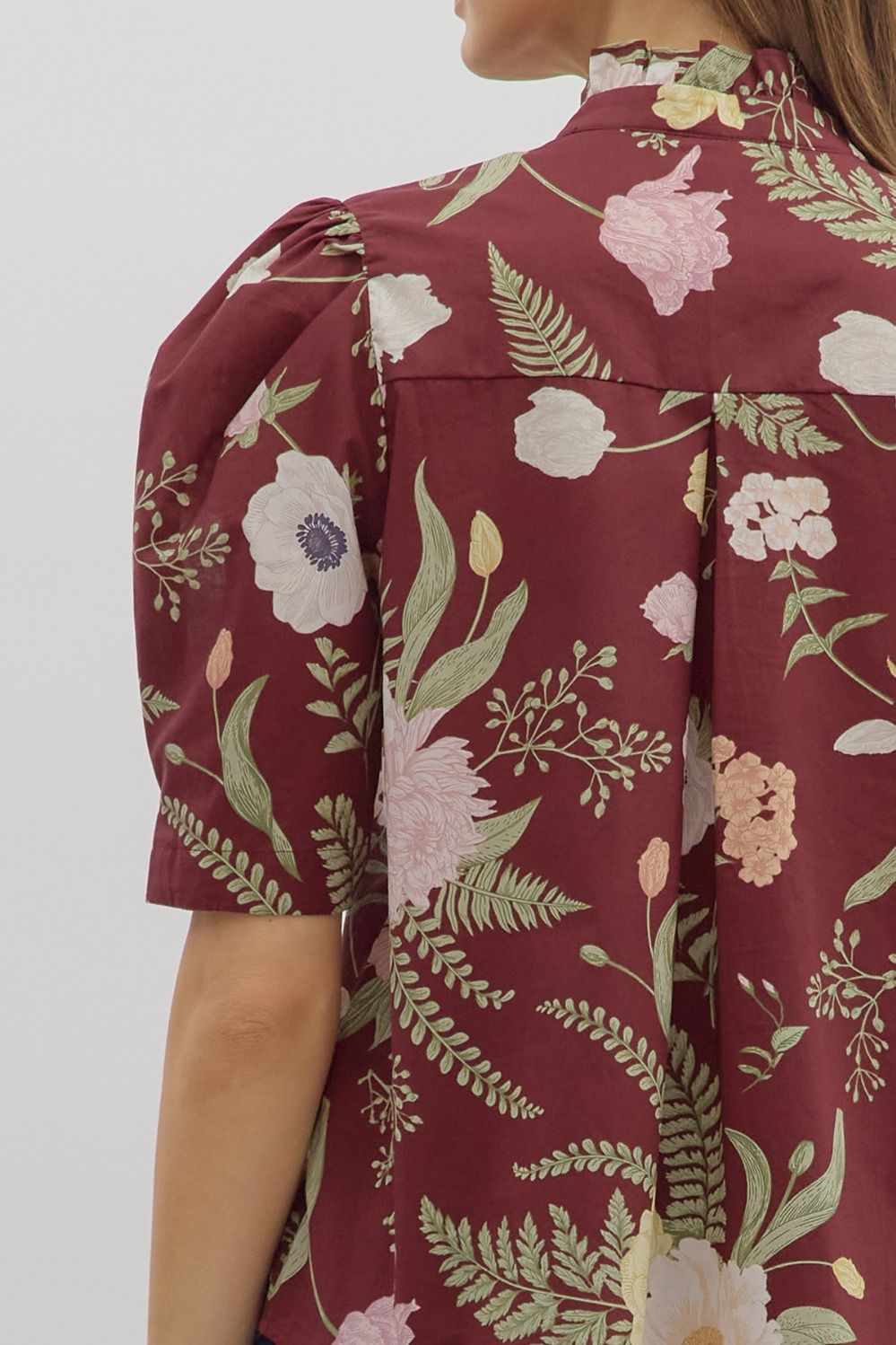 This woven blouse features a delicate floral print, a ruffled neckline, and a button-front closure for a feminine touch. The pleated short puff sleeves add subtle volume, making it a stylish choice for breathable, unlined comfort.