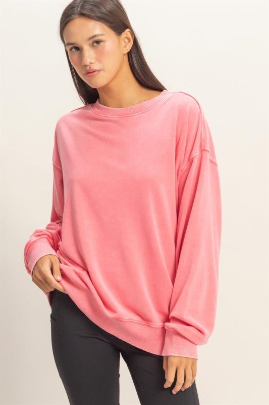This essential sweatshirt offers ultimate comfort with soft French terry, featuring a mineral washed finish providing a faded, vintage texture. The design includes a ribbed crew neckline and dropped shoulders with full long sleeves and ribbed cuffs. With an oversized and relaxed fit, it pairs perfectly with joggers and sneakers for a laid-back look. Self : 80% Cotton / 20% Polyester