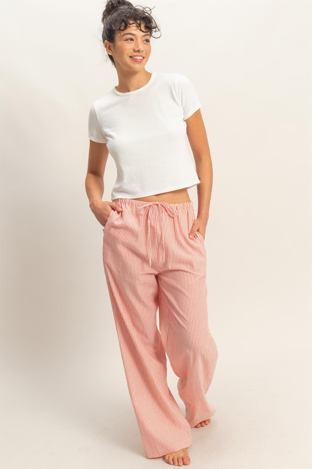 Nothing screams spring more than these trendy pants. Decorated with a striped pattern, these pants offer a high-rise with an elasticized waist and drawstring detail. The pant legs have a wide cut.
