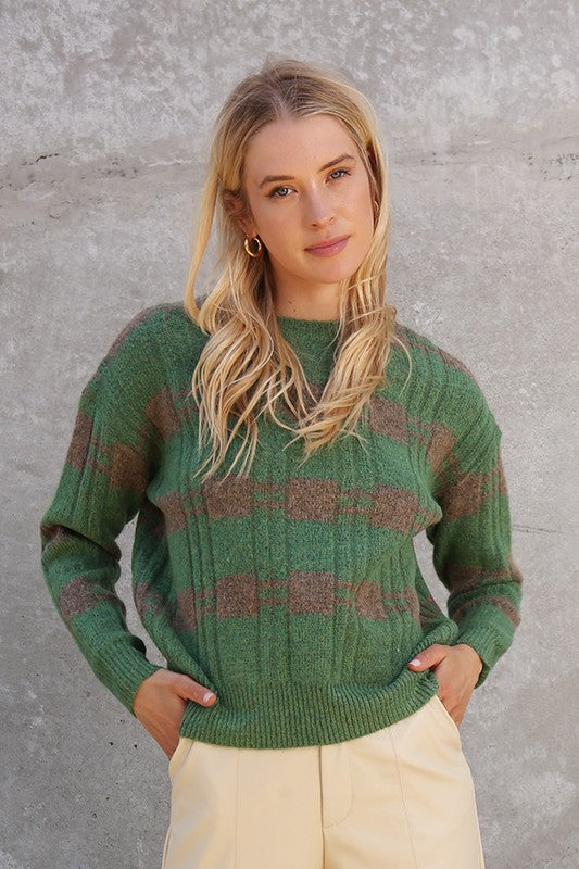 Stay warm and stylish with our charming checkered knit sweater. This cozy piece features a soft, medium-weight knit in earthy green and beige tones. The checkered pattern adds a classic yet contemporary touch, making it perfect for both casual and semi-dressy occasions. Designed with a relaxed fit, ribbed cuffs, hem, and a crew neckline, this sweater pairs effortlessly with everything from jeans to trousers for an effortlessly chic look. Ideal for layering or wearing solo on crisp days