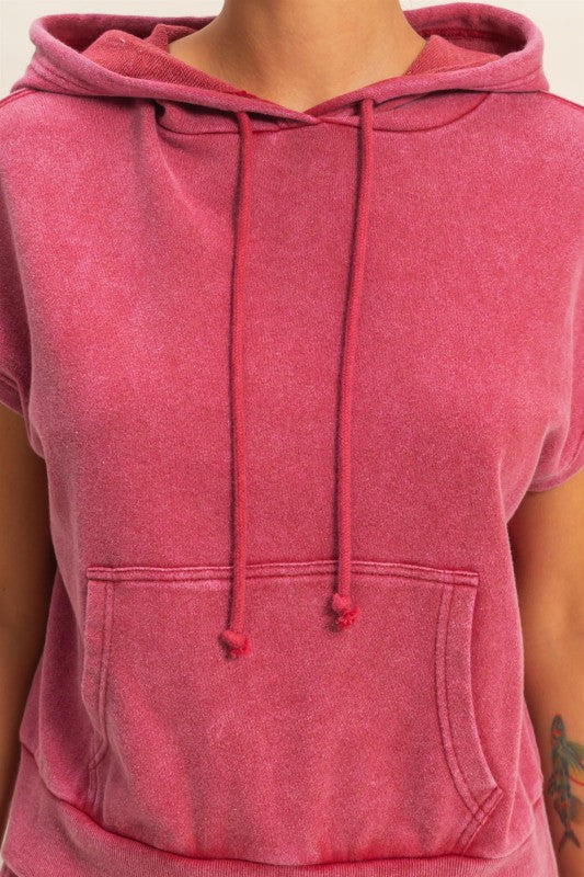 Featuring a acid-wash finish, this contemporary sleeveless French terry hoodie includes a hood with a functional drawstring and a relaxed kangaroo pocket at the front. With a relaxed, boxy fit finished with a ribbed hemline, this comfortable piece pairs seamlessly with high-waisted shorts or joggers for a laid-back athleisure look.