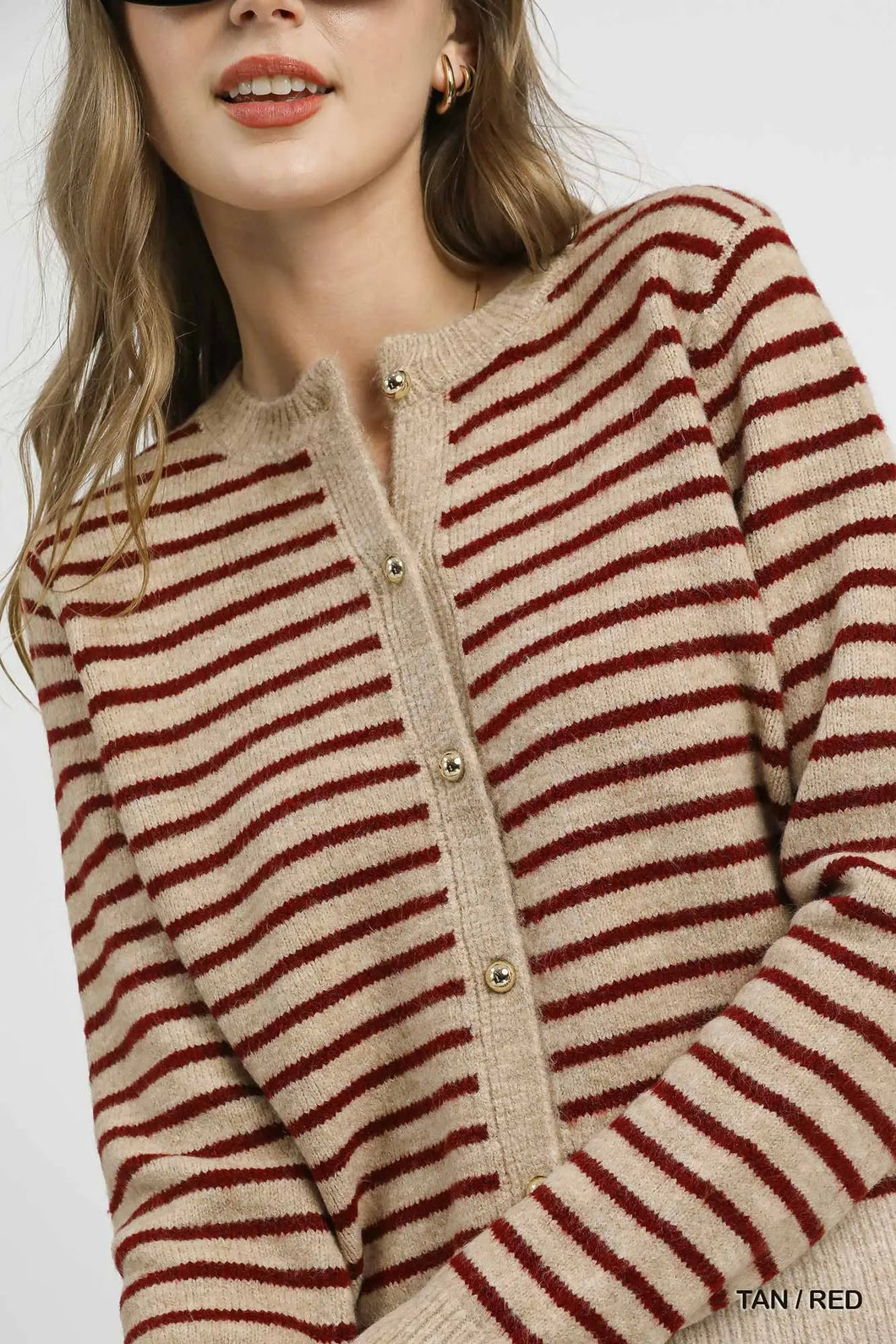This striped button-up knit cardigan features a timeless crew neck and cozy long sleeves with ribbed cuffs for a comfortable fit. The classic stripe pattern adds a casual, laid-back vibe, while the button-up front makes it easy to layer over your favorite tops. Perfect for everyday wear, it combines style and comfort effortlessly.