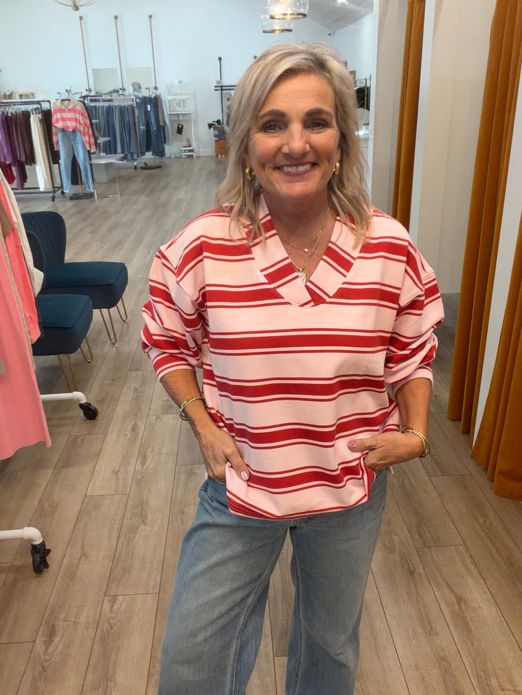 Meet your new go-top! This striped French terry top brings a fun, relaxed vibe to your everyday rotation. Soft knit fabric keeps you cozy while the classic horizontal stripes add just the right amount of personality. Throw it over a tee, pair it with your favorite bottoms, or wear it solo—this versatile top plays well with everything. Perfect for those days when you want comfort without sacrificing style. Simple, cheerful, and endlessly wearable.