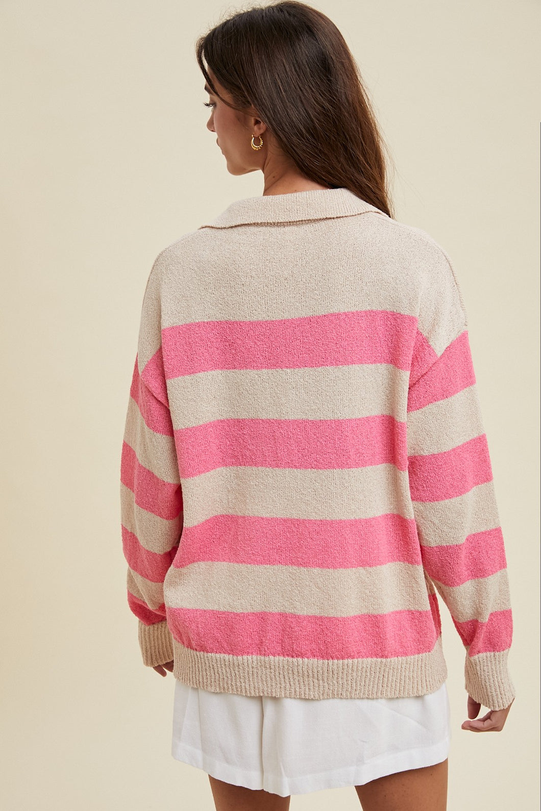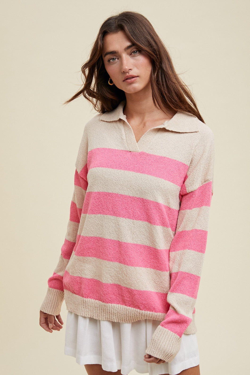 This lightweight collared sweater top features charming stripes that add a playful touch to your outfit. Its breathable fabric keeps you comfortable all day, while the classic collar gives it a sweet, polished look perfect for casual outings or cozy days in. Easy to pair and effortlessly cute!