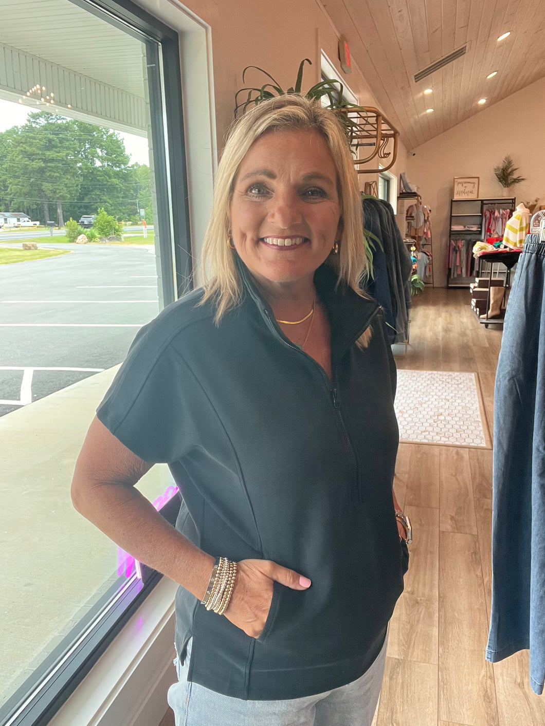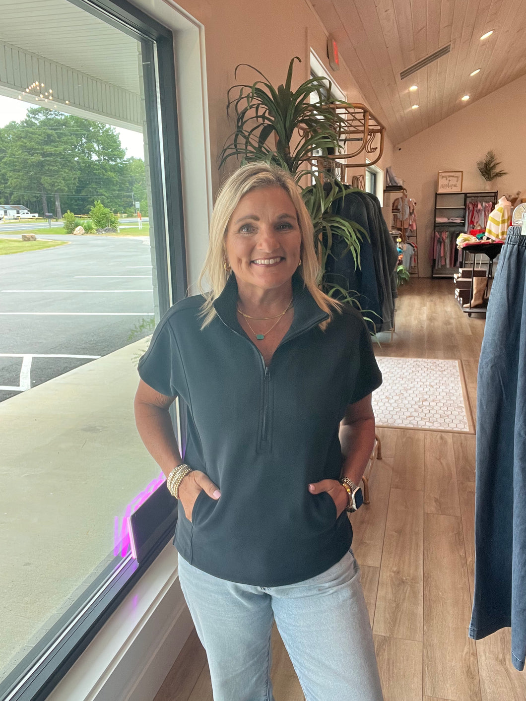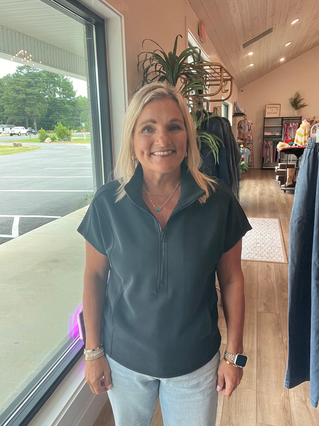 This effortlessly chic top features a boxy cut for a relaxed and contemporary fit. The short dolman sleeves provide a drapey, comfortable silhouette, while the half zip down the front adds a modern touch and allows for adjustable styling. Designed without lining, this piece offers a lightweight, breathable feel, perfect for layering or wearing solo. Ideal for casual outings or relaxed workdays, this versatile style combines comfort with a hint of edge.