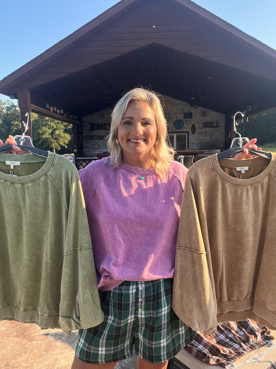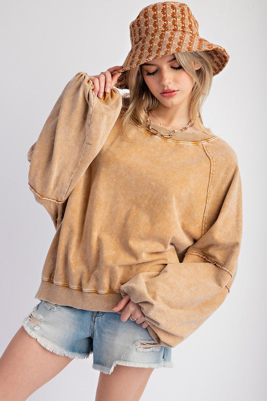 This mineral washed terry knit pullover offers a relaxed, loose fit perfect for casual comfort. Featuring long bubble sleeves and a rounded neckline, it combines style with ease. Ribbed band cuffs and hem add subtle structure, while dropped shoulders and raw cut seam detailing give it a laid-back, modern edge. Ideal for everyday wear, this pullover blends softness with unique design elements.