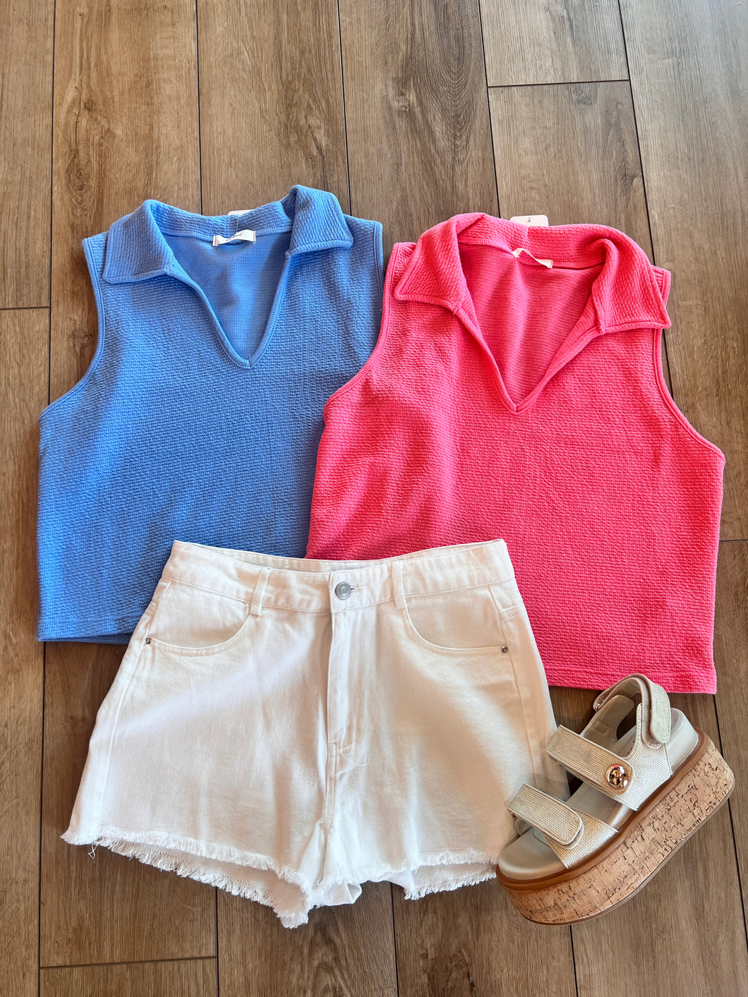 This cloud knit collared sleeveless cropped top is as cute as it is comfortable. Made from soft, lightweight material, it's perfect for warm weather days. The cropped design is trendy and the collar adds a touch of sophistication. Pair it with high-waisted jeans for an effortlessly chic look.